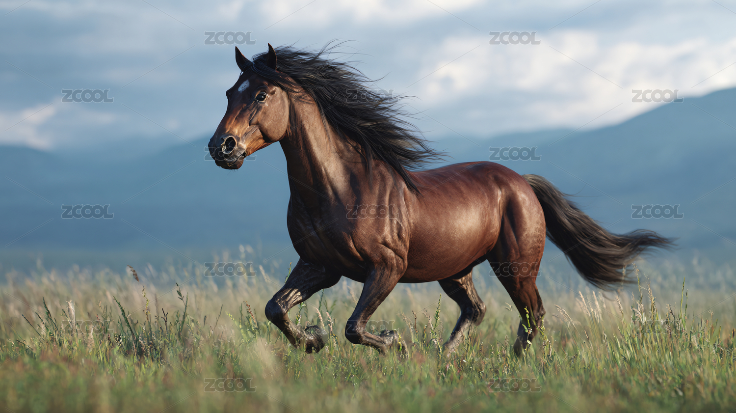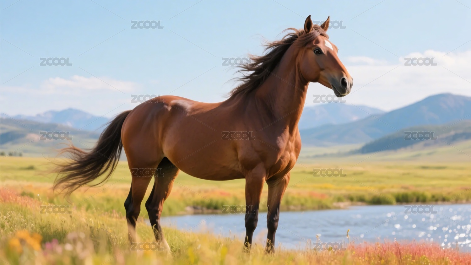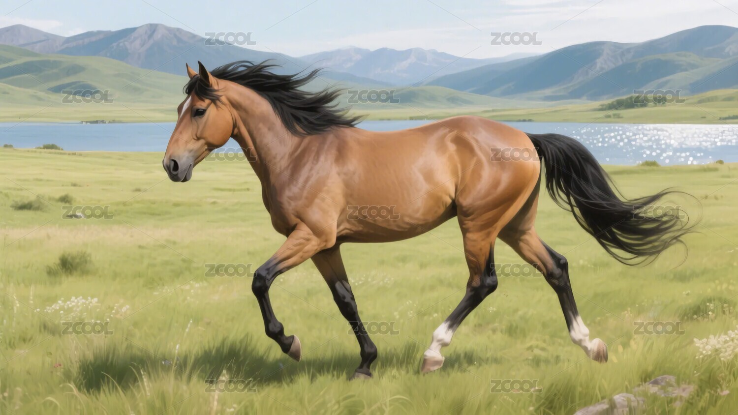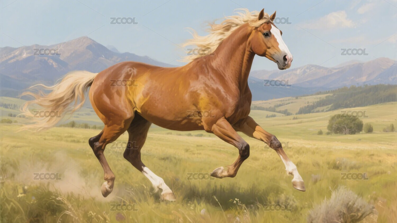 骏马,草原,山丘,花朵,自然,风景,插画,矢量,动物,奔跑