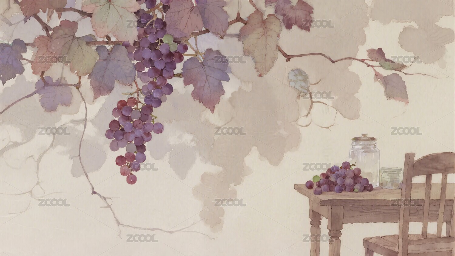 葡萄,藤蔓,桌椅,罐子,插画,静物,场景,背景,墙面,影子