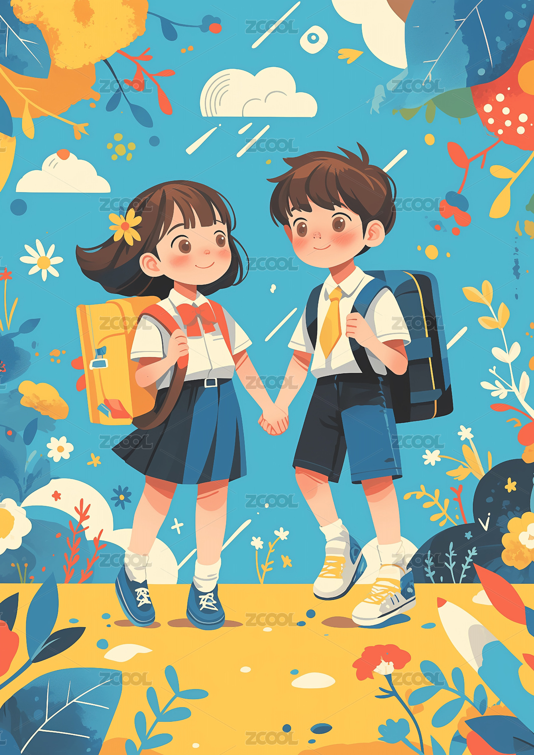 学生,校园,建筑,草地,插画,青春,结伴,行走,书包,阳光