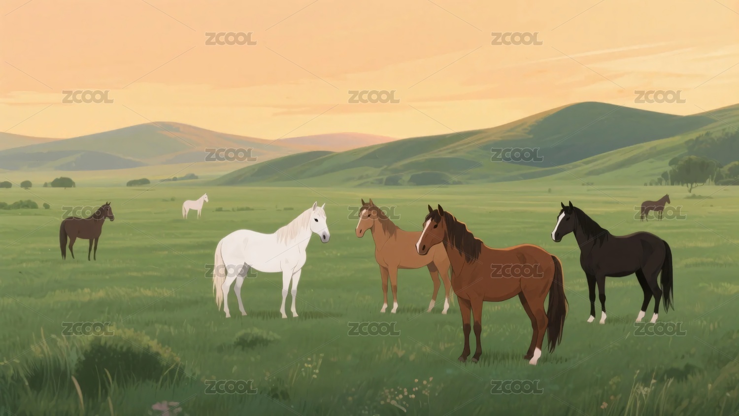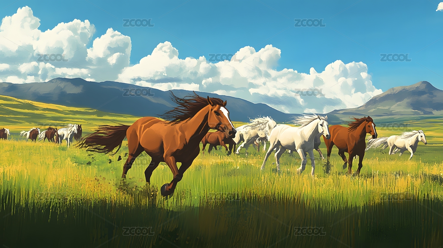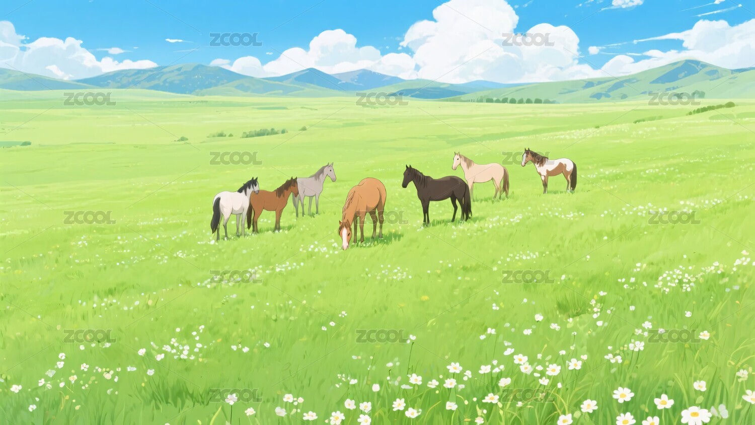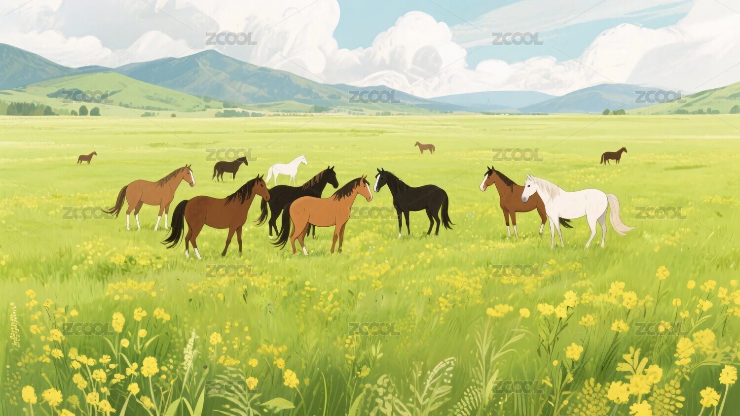 草原,山脉,天空,云朵,自然,风景,插画,动物,草地,主题