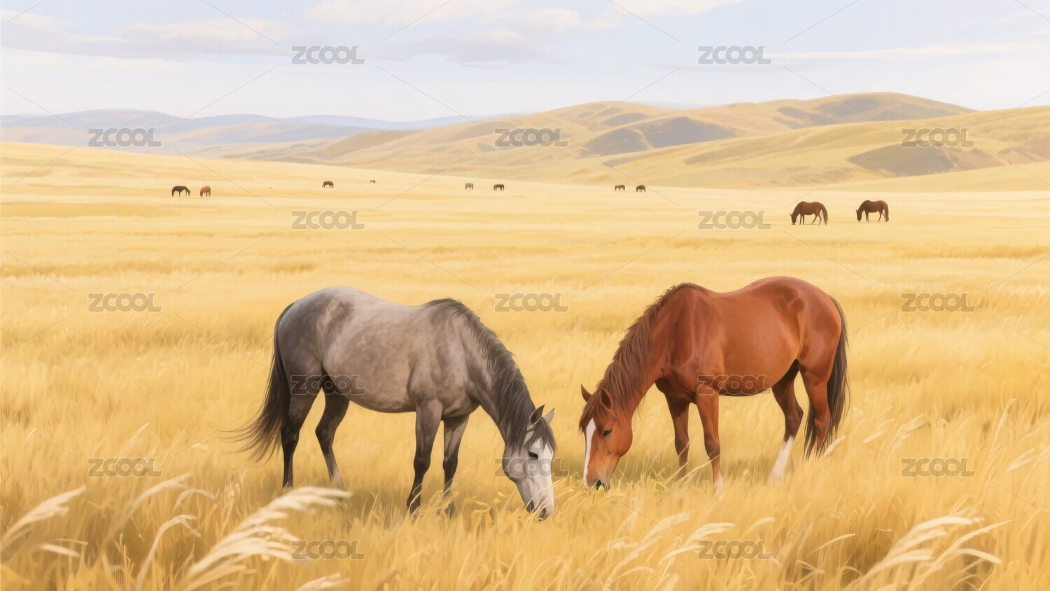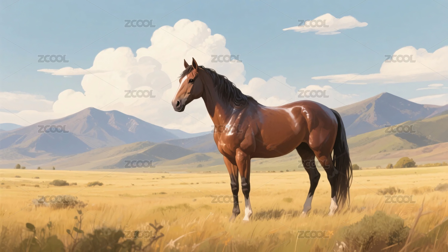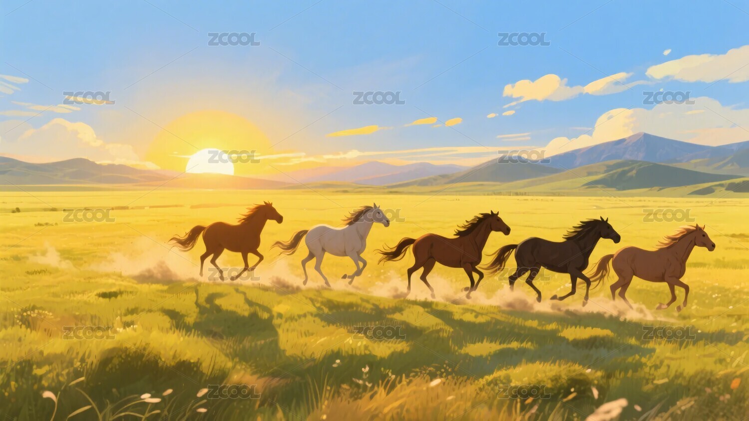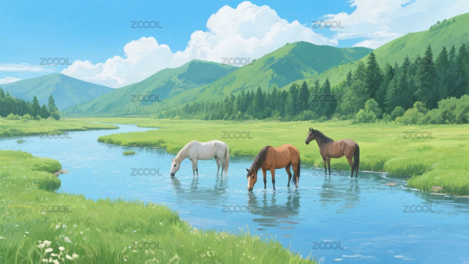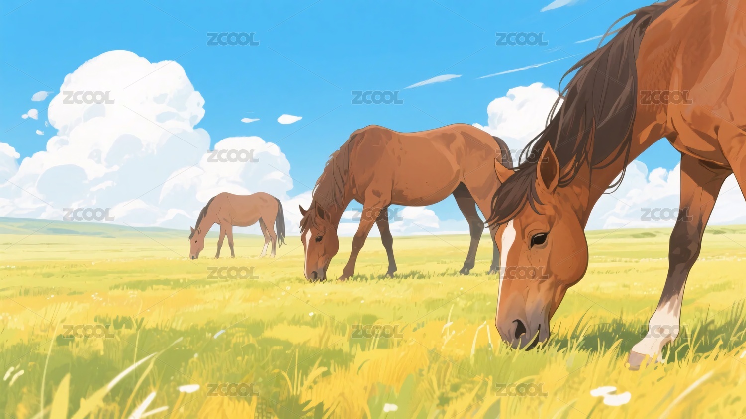 草原,山脉,天空,云朵,自然,风景,插画,动物,草地,主题