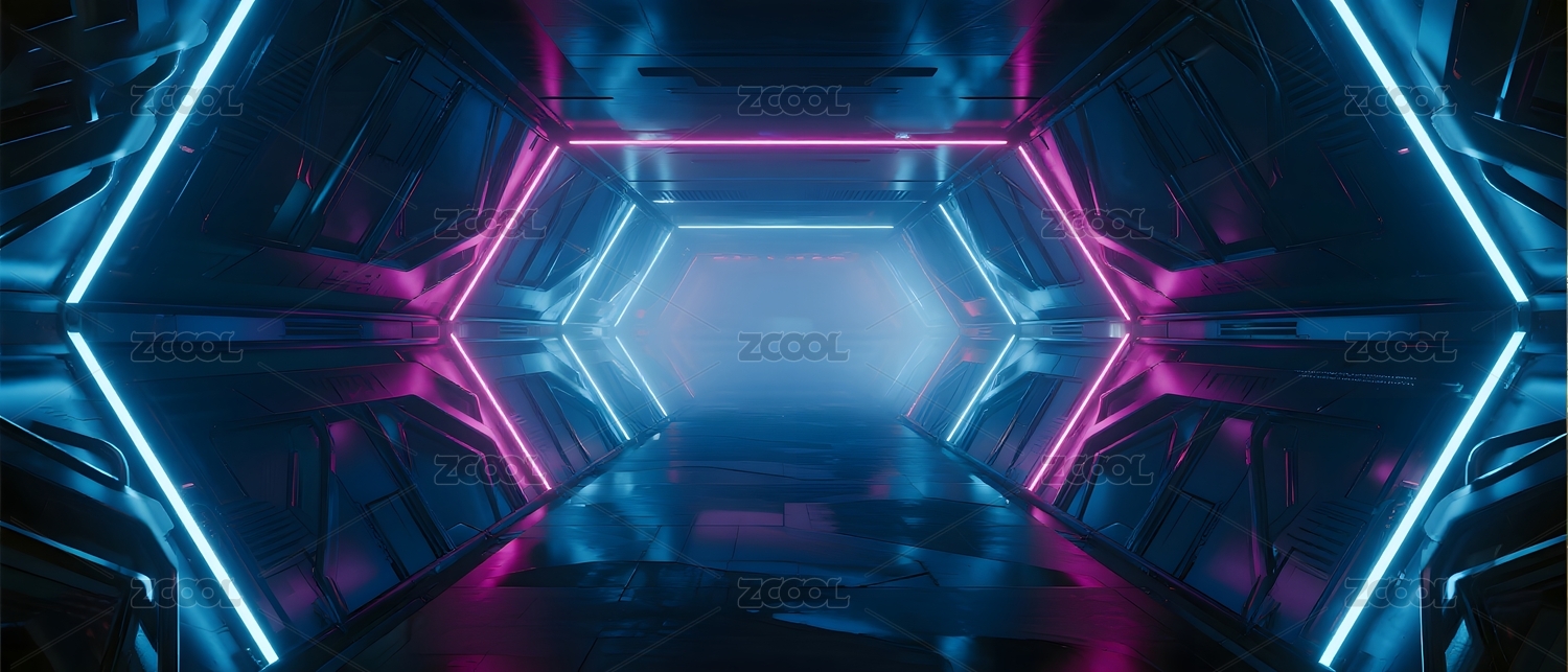 现代,霓虹灯,走廊,未来感,光线,几何,室内,抽象,设计,明亮