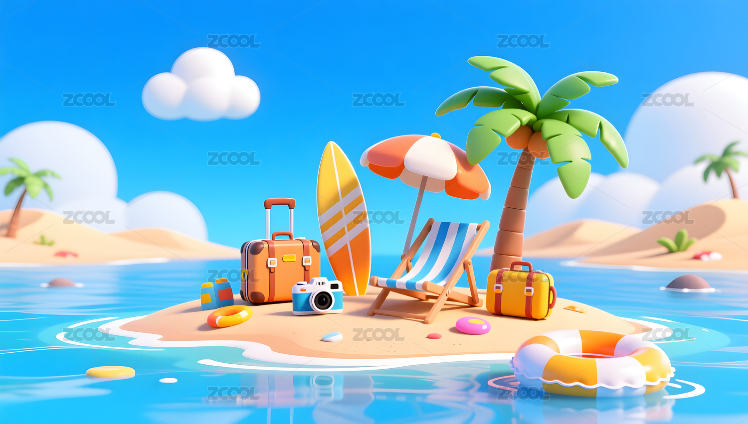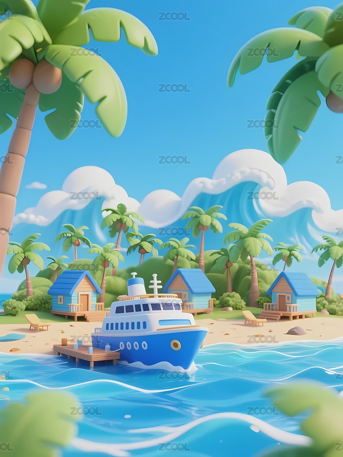 3D卡通海边沙滩房屋椰子树插画模型