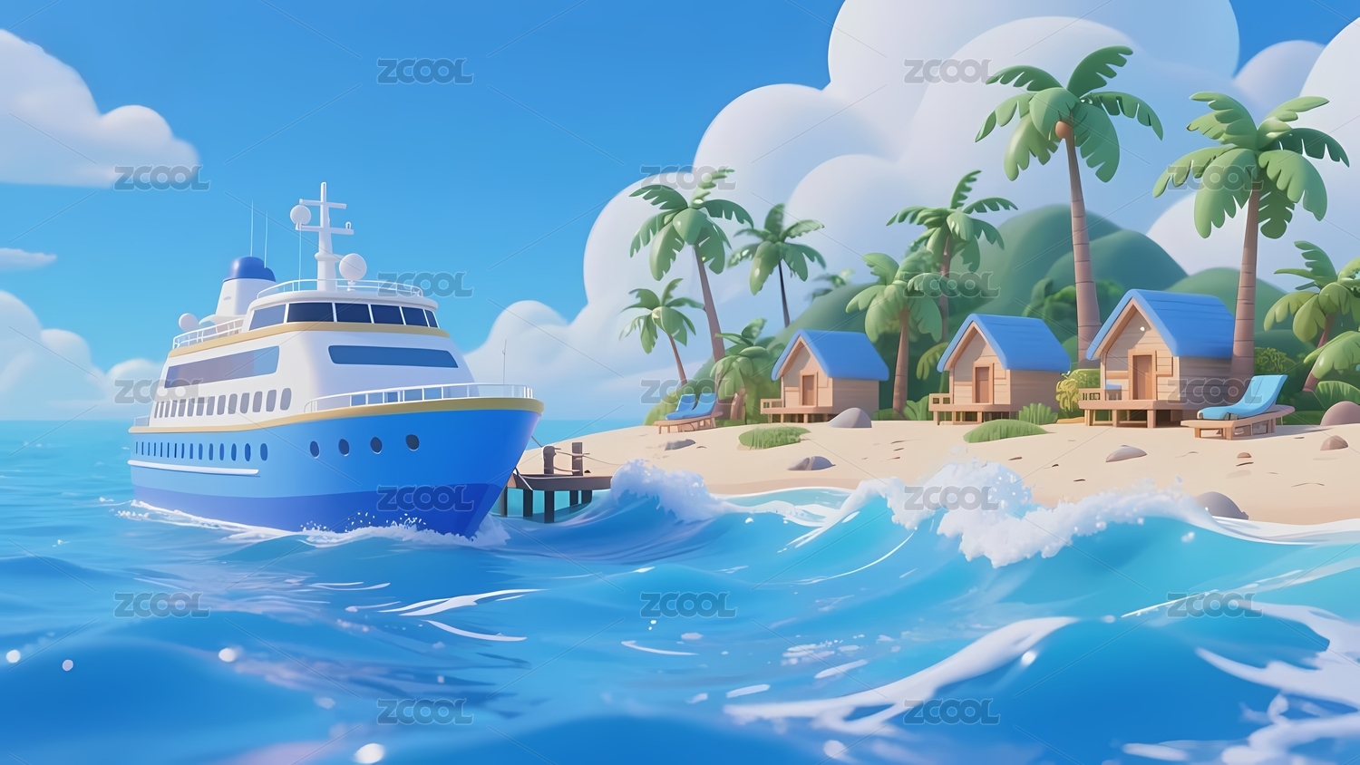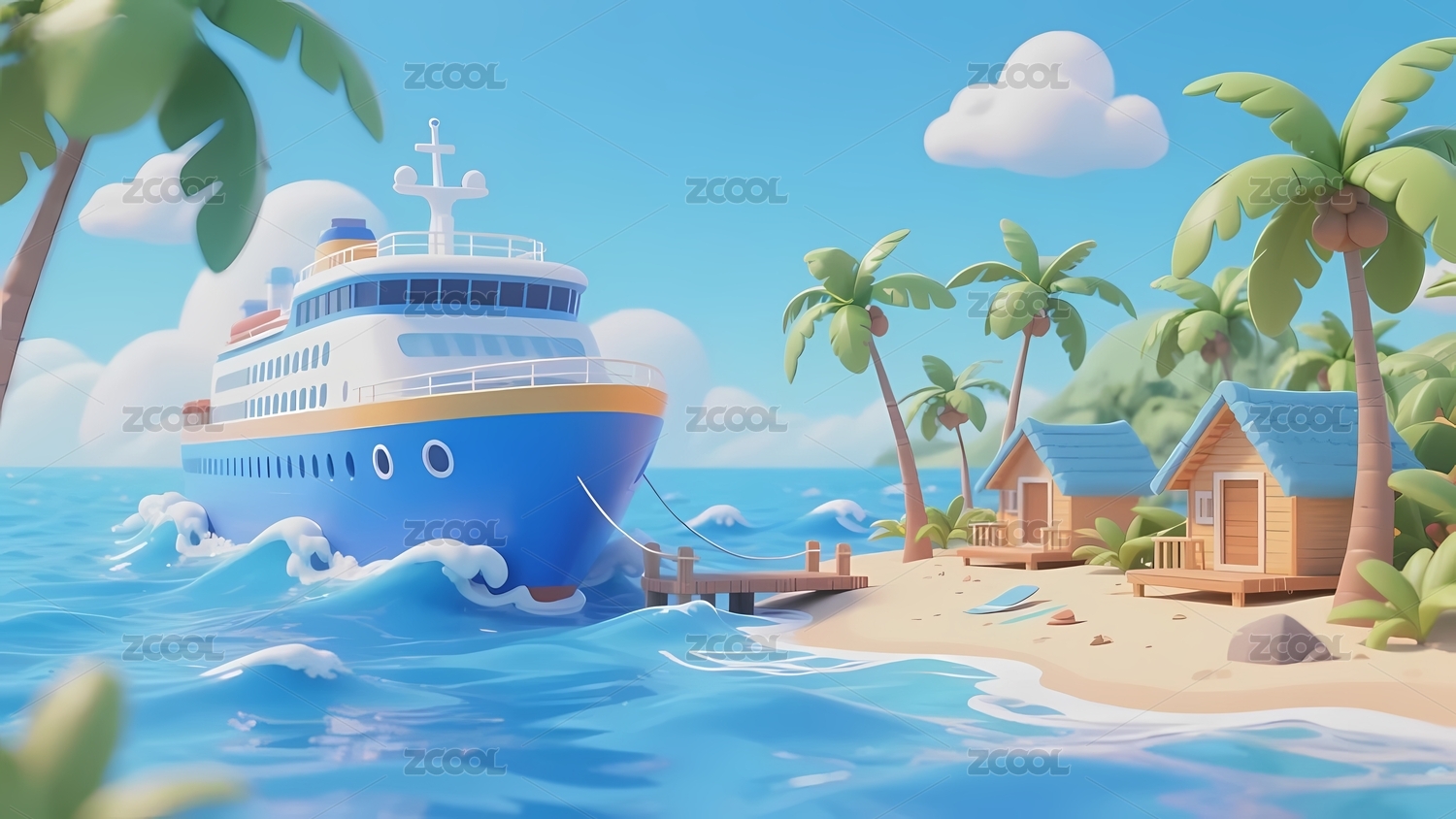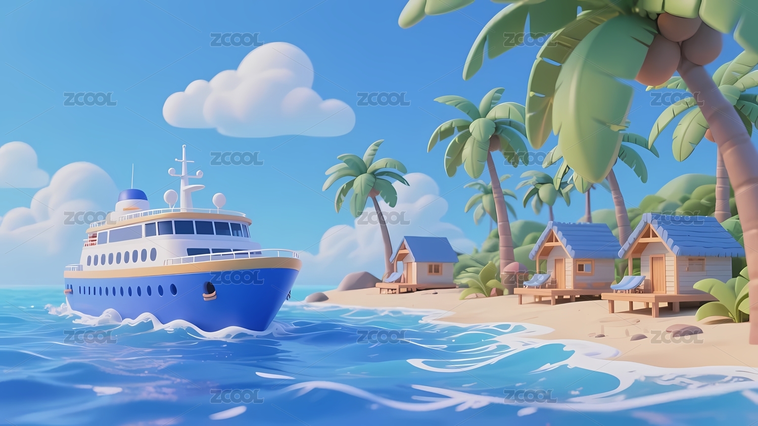 假期出行的海上轮船3D场景插画