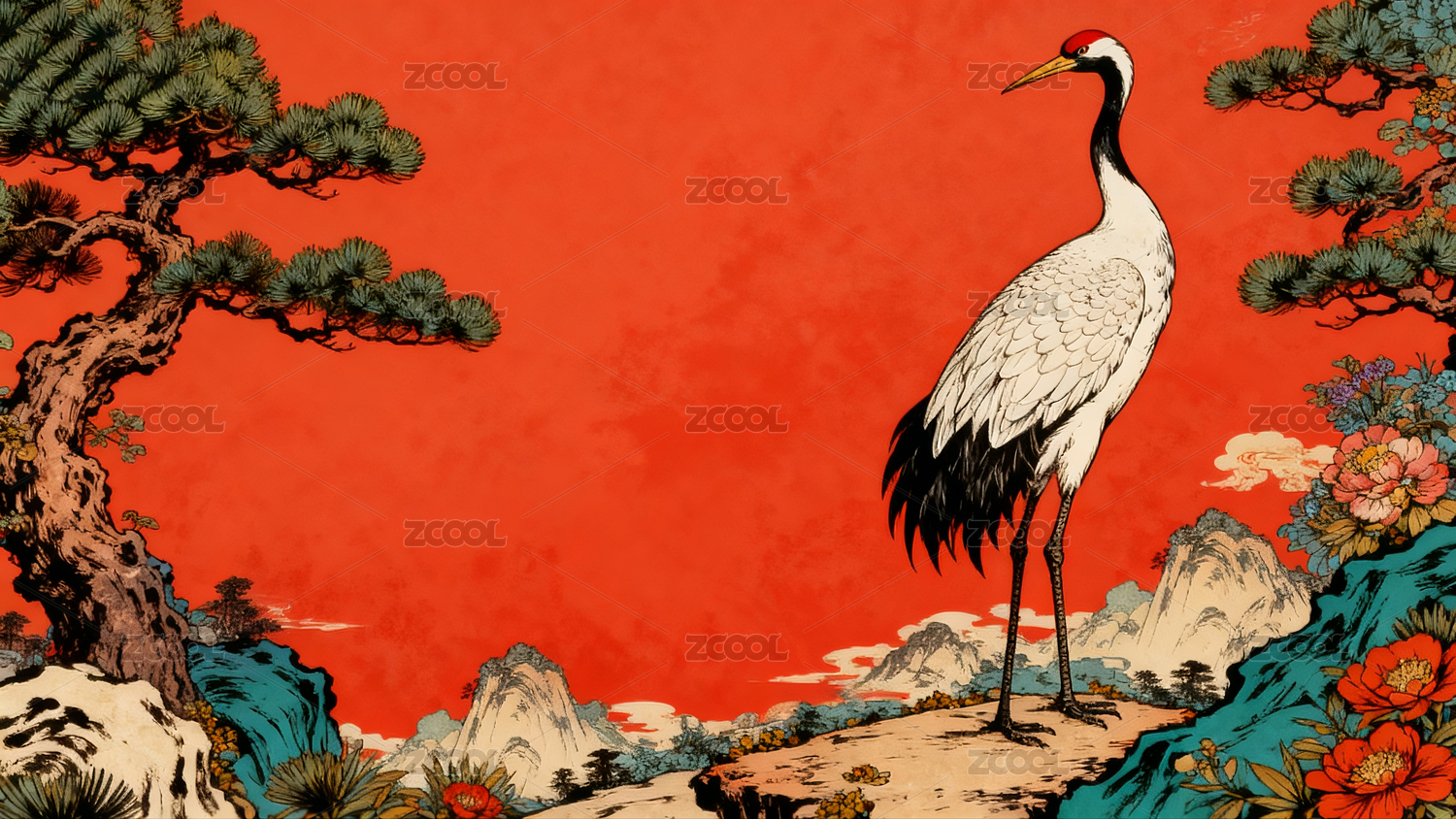 中式风格的仙鹤与松树