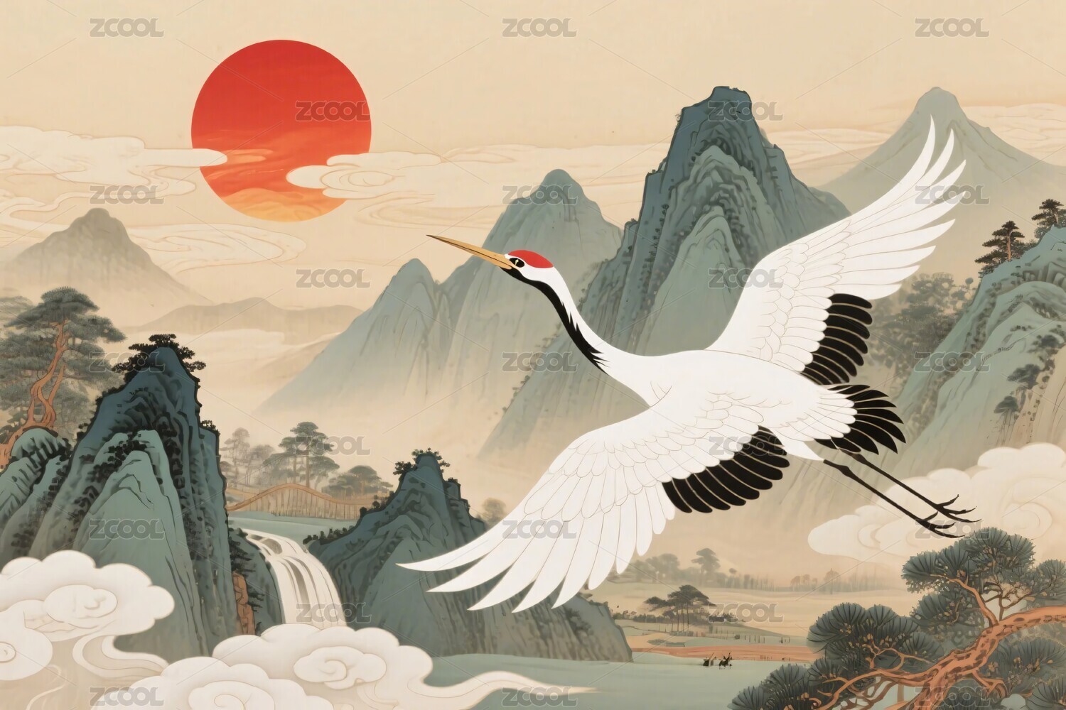 山水丹顶鹤插画