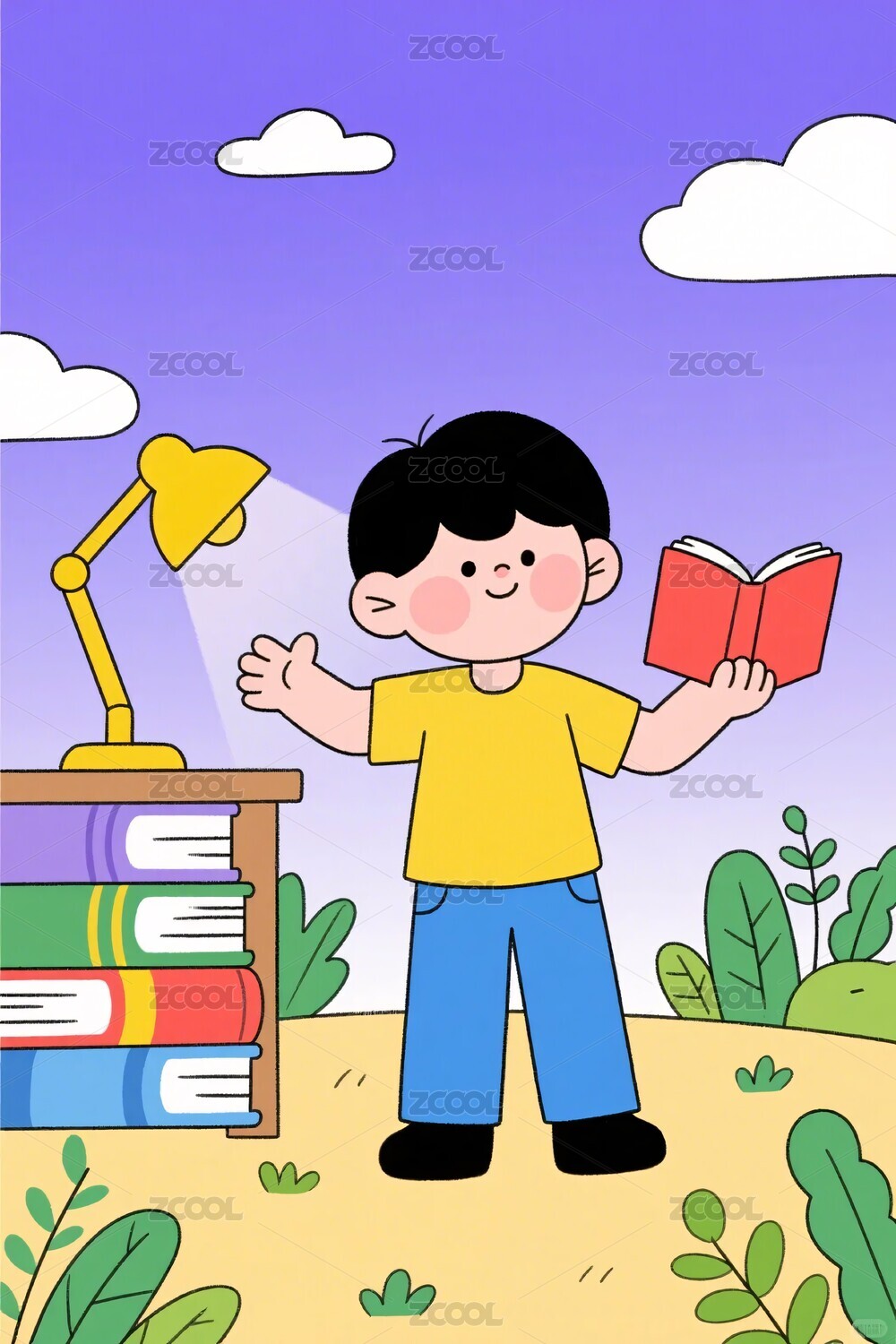 男孩户外读书场景插画