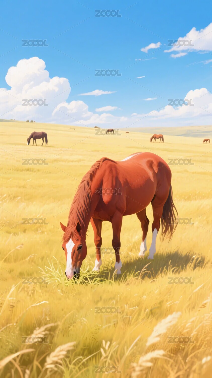 草原,骏马,马群,自然,风景,插画,矢量,蓝天白云,草地,动物