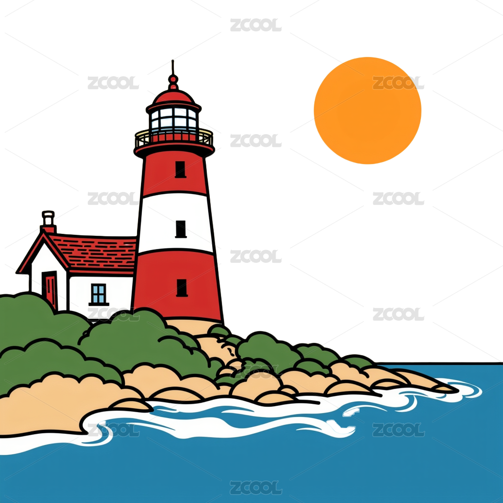 夏天海滩旅行岛屿灯塔自然度假冒险航海插画