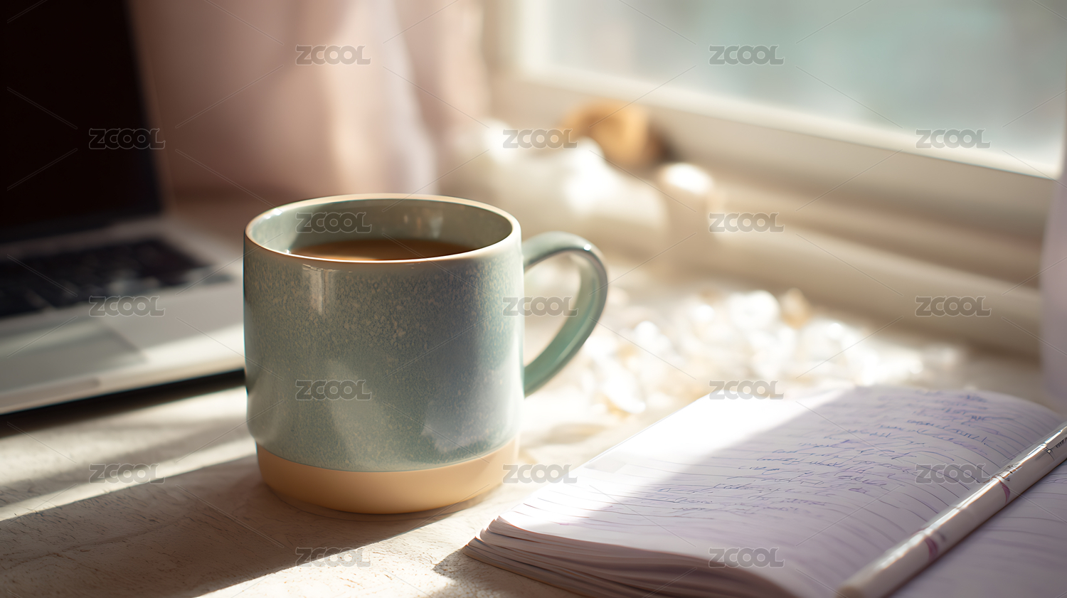 咖啡,笔记本,杯子,笔,桌子,窗户,阳光,植物,影子,室内
