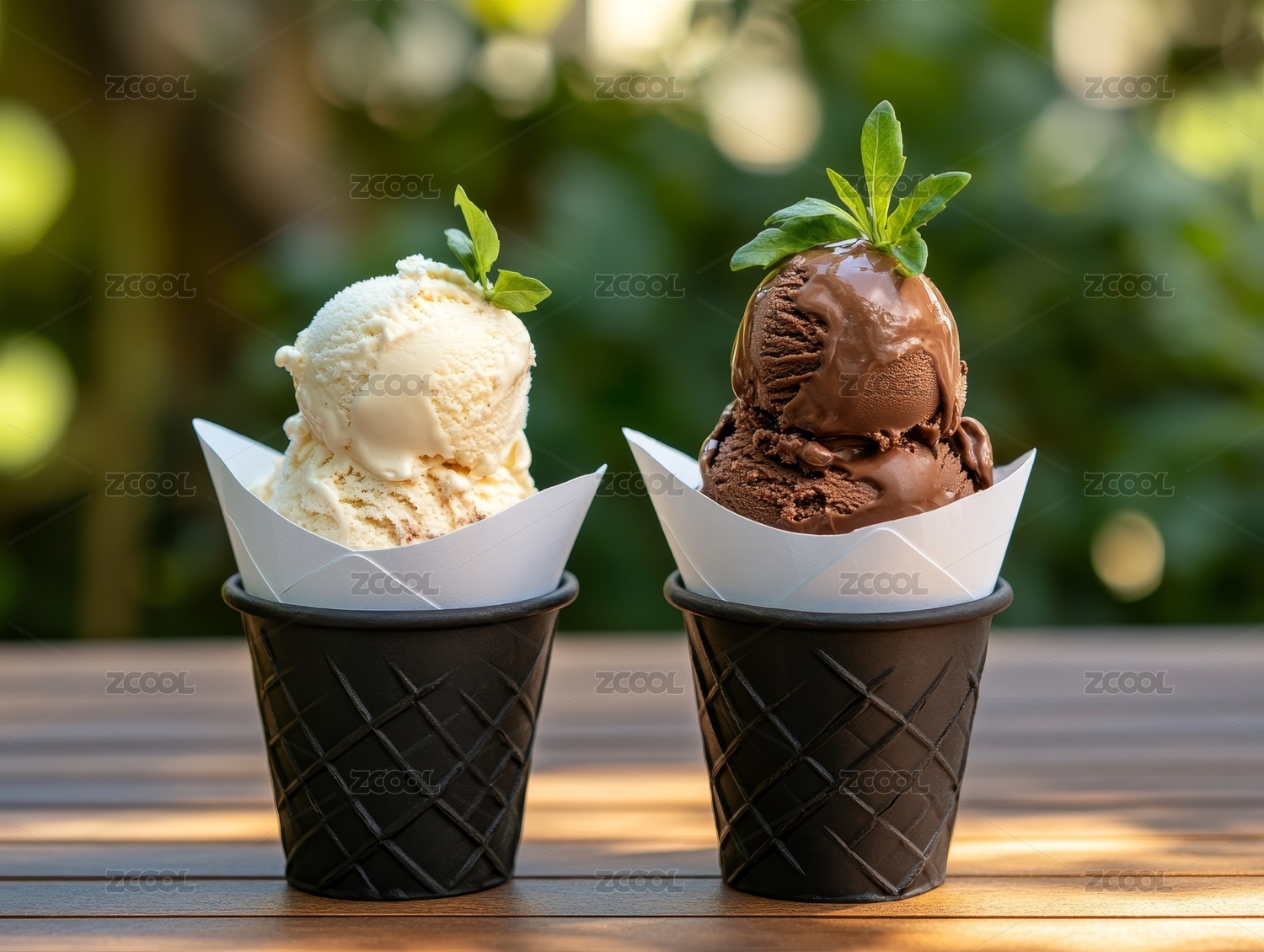 双色冰淇淋配绿植装饰