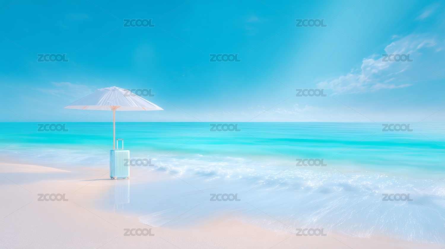 蓝天白云下沙滩上放着沙滩椅和遮阳伞