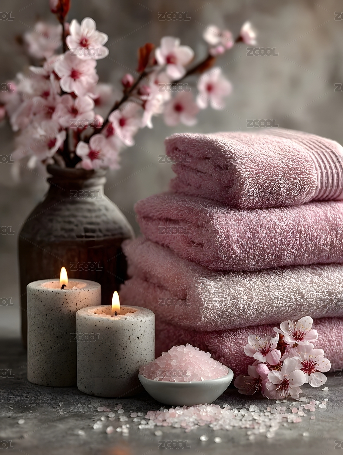 水疗SPA场景灰紫色毛巾香氛蜡烛