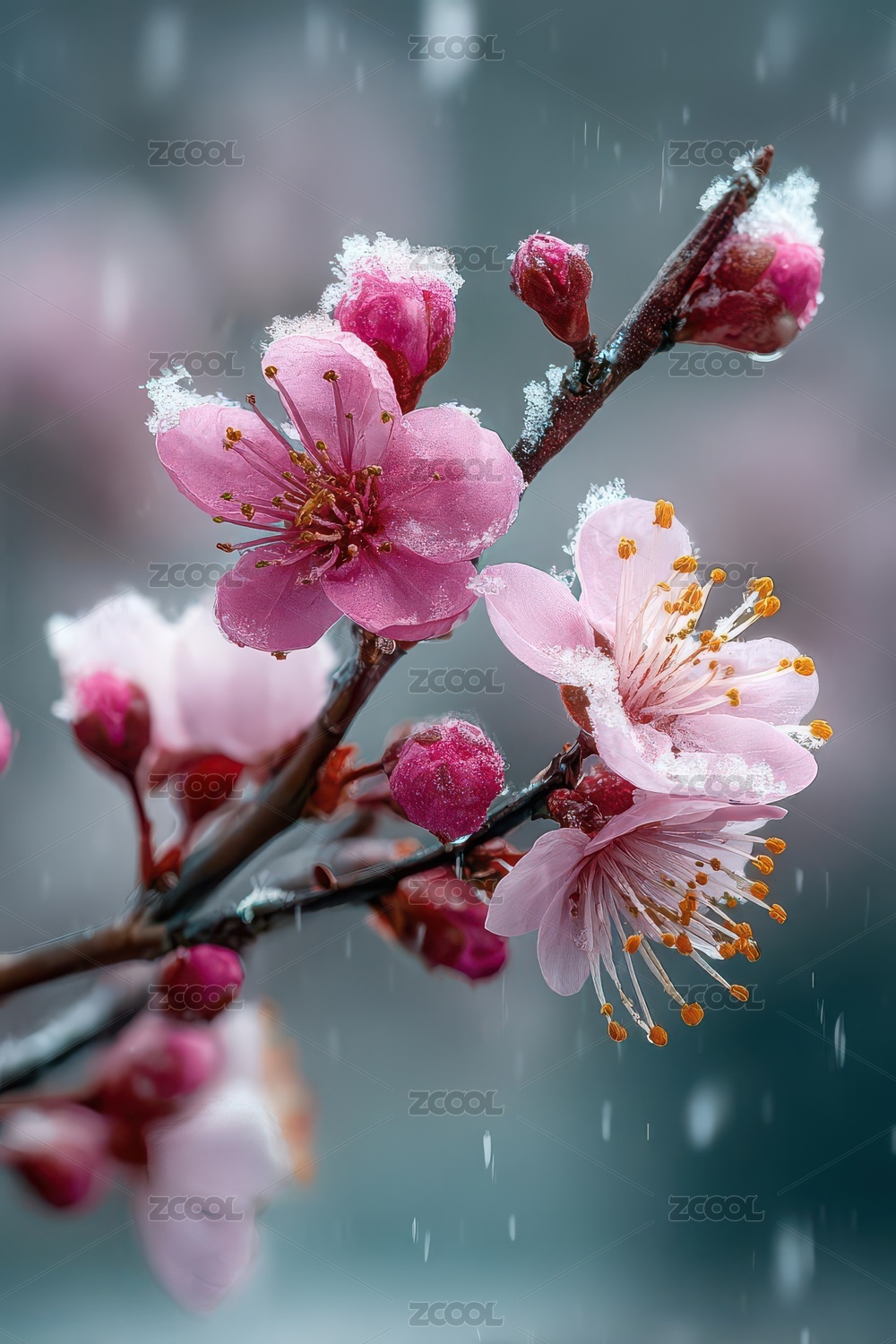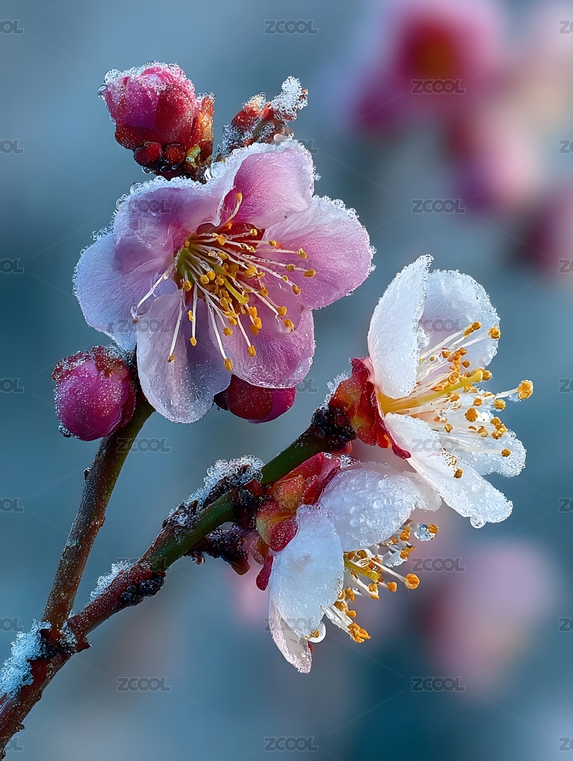 冬日梅花冰雪绽放