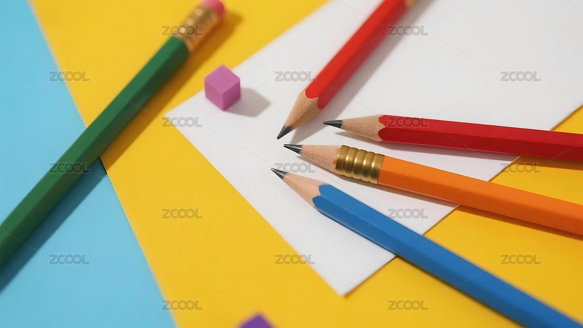 彩色铅笔与橡皮围绕白纸