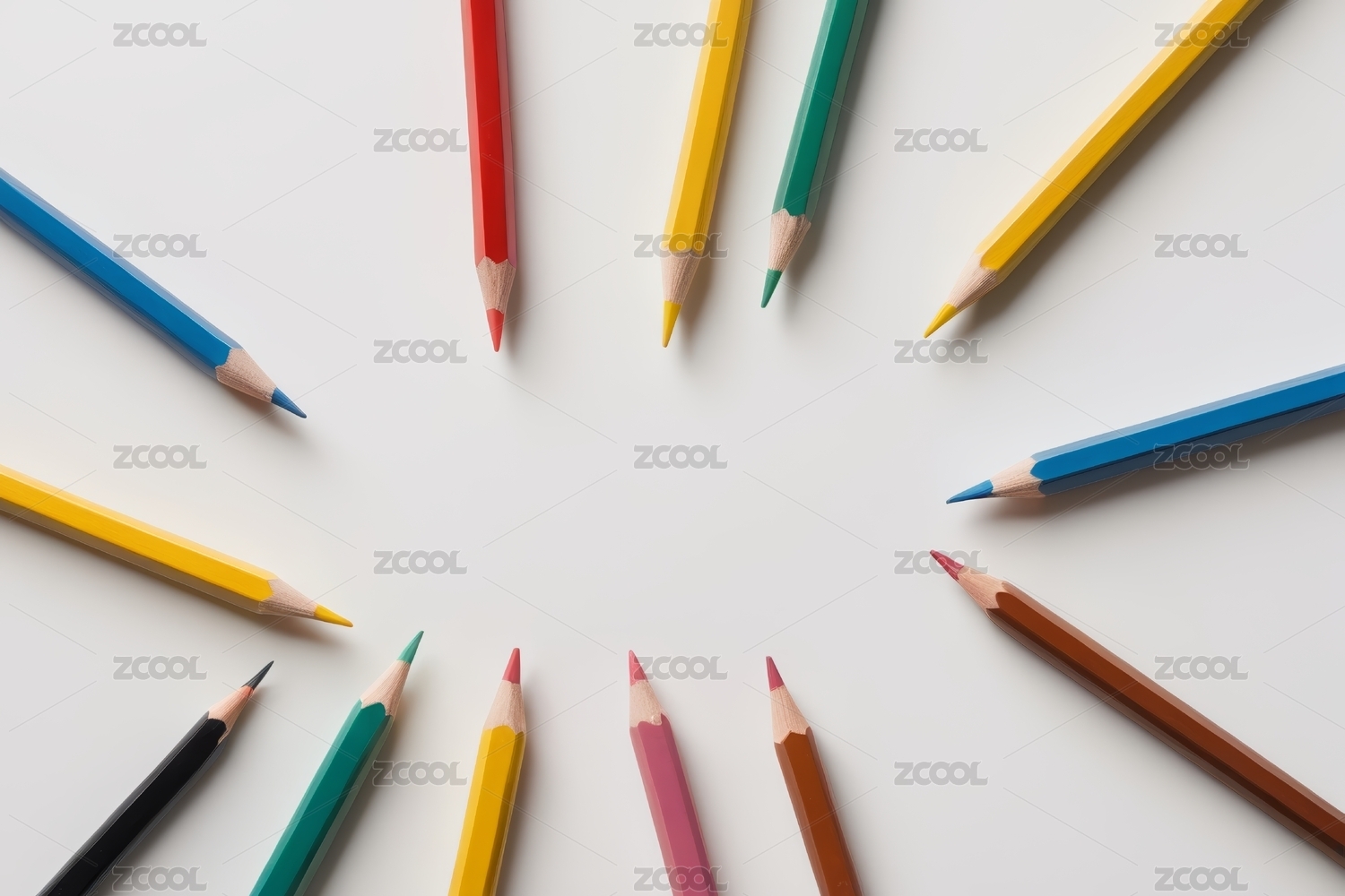白色背景上一圈彩色铅笔的特写高清图片