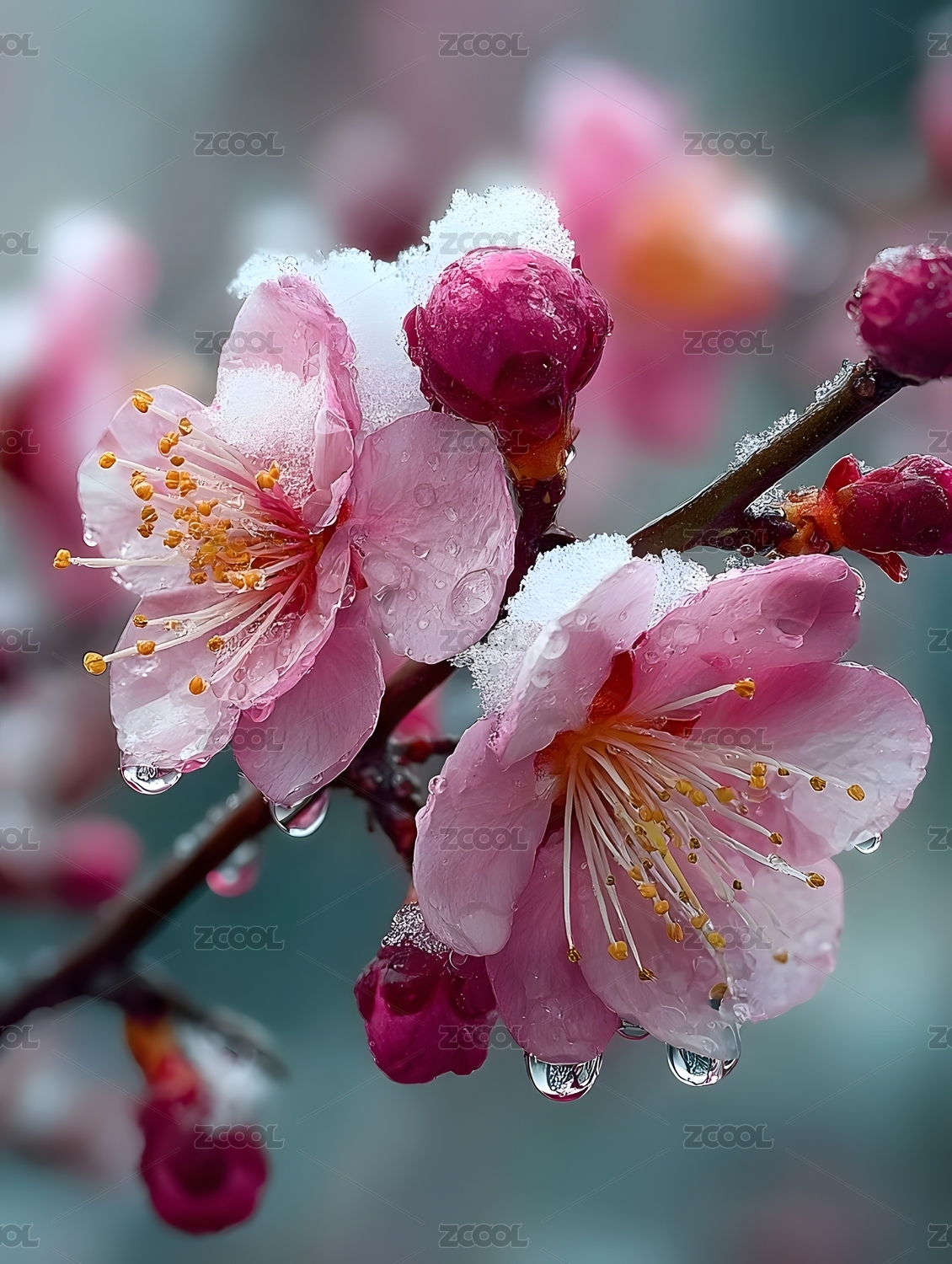 水滴,花朵,花瓣,白色,粉色,枝条,冰晶,冻结,自然,花蕊