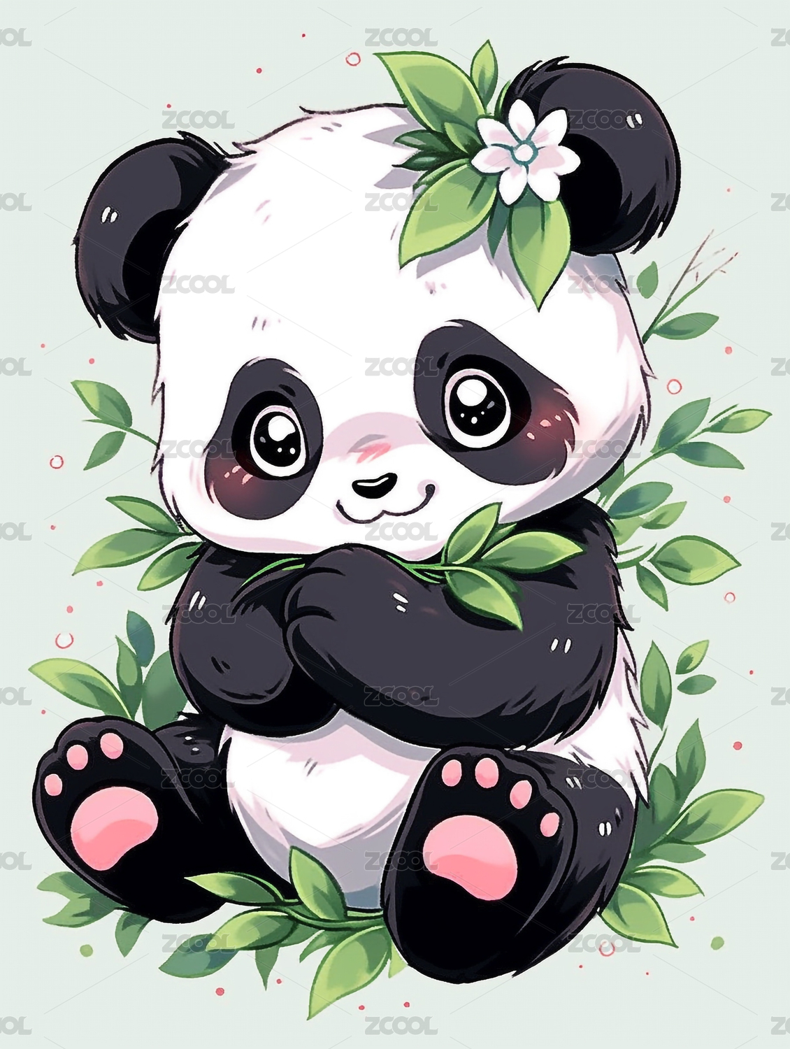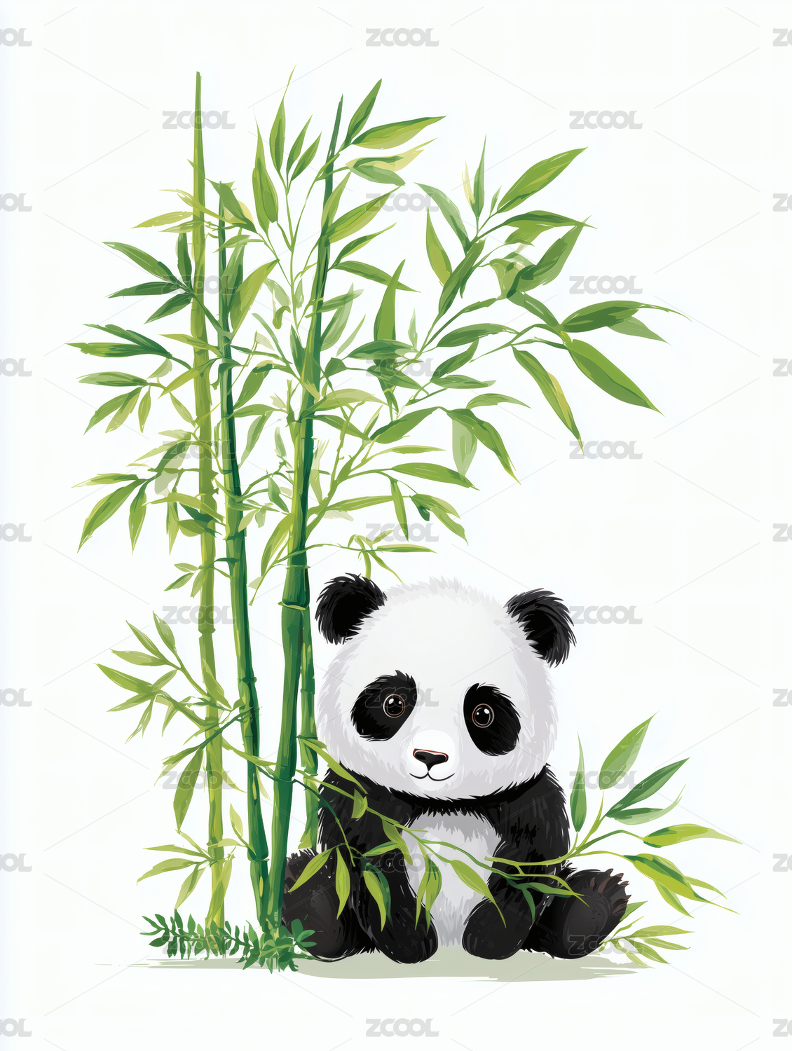 水墨插画风中国国宝吉祥物熊猫拿着竹子微笑