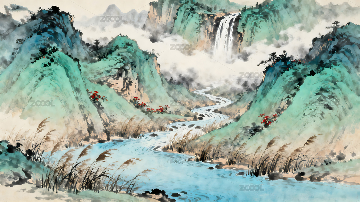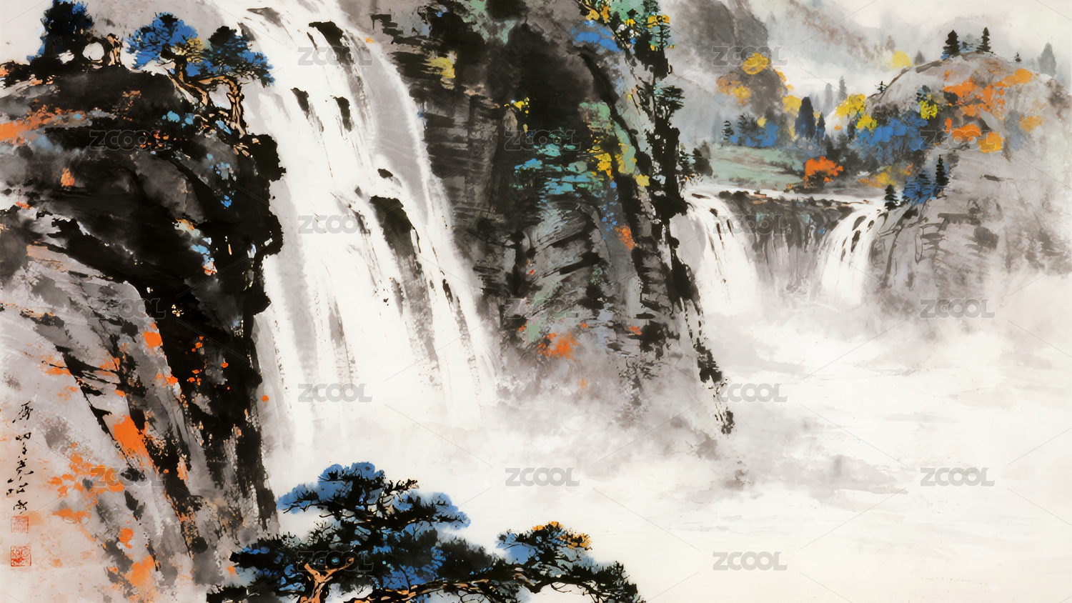 自然, 瀑布, 小屋, 风景, 水墨, 幽静, 乡村, 环境, 和谐,山水