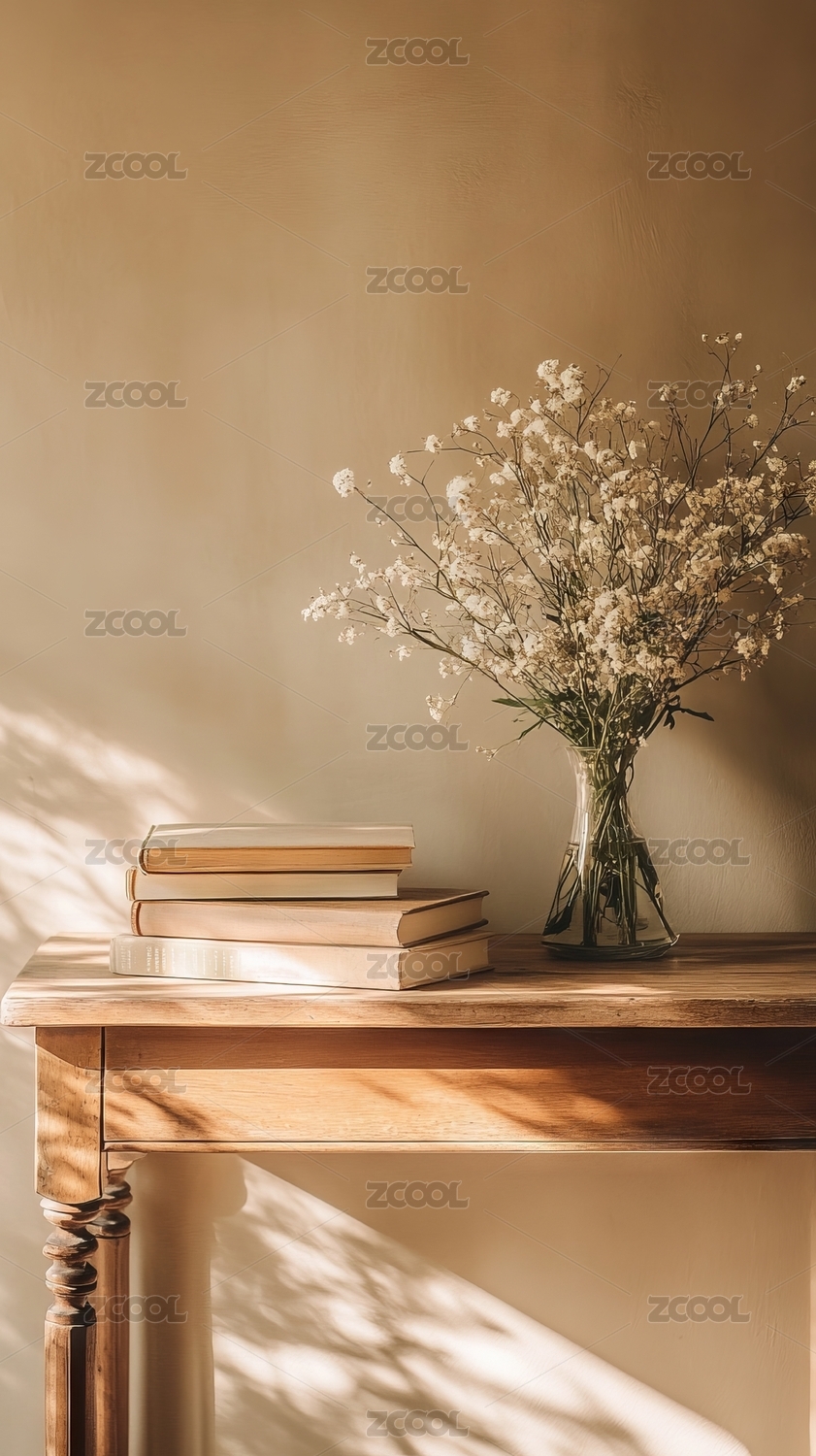 木质墙面上复古挂钩与温暖壁灯下的干花