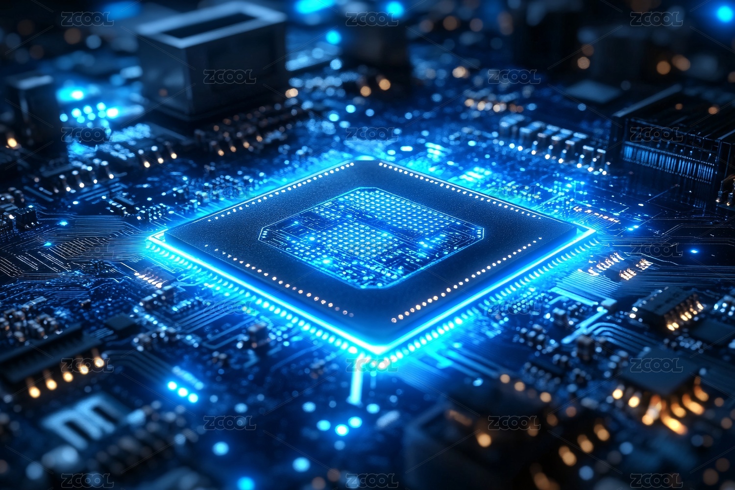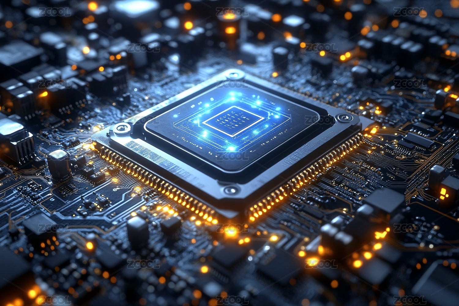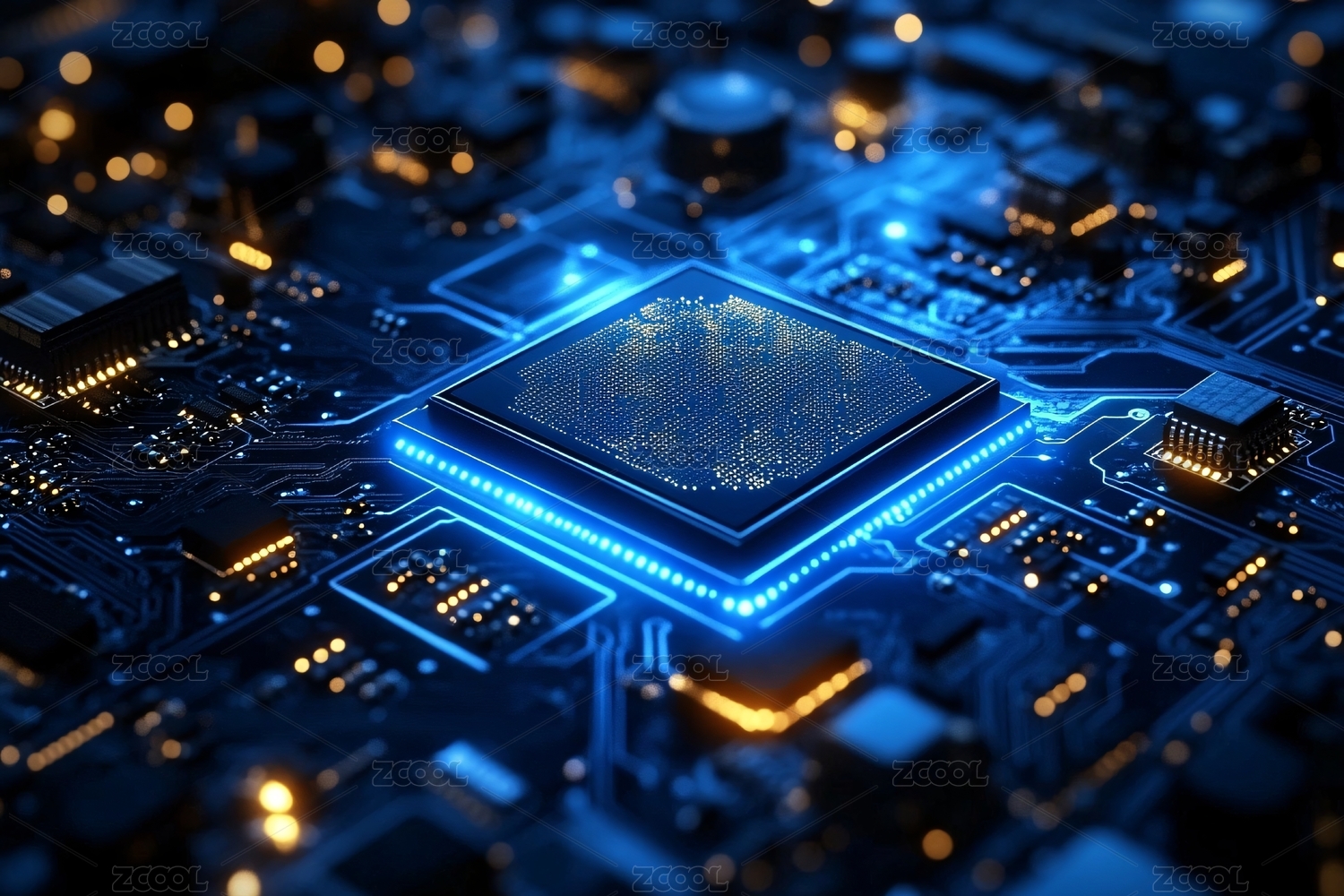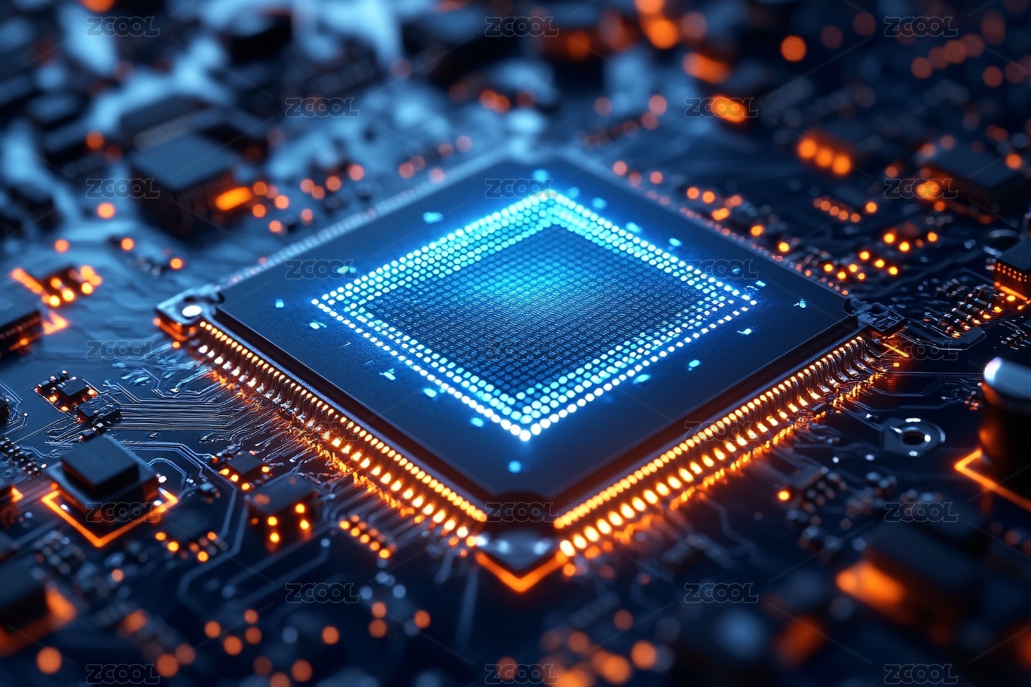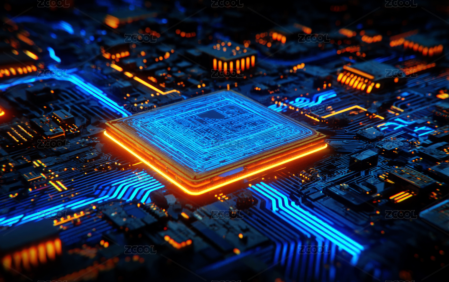 高科技电路板芯片,蓝色与橙色光芒交错闪耀