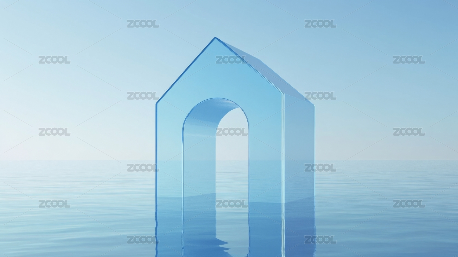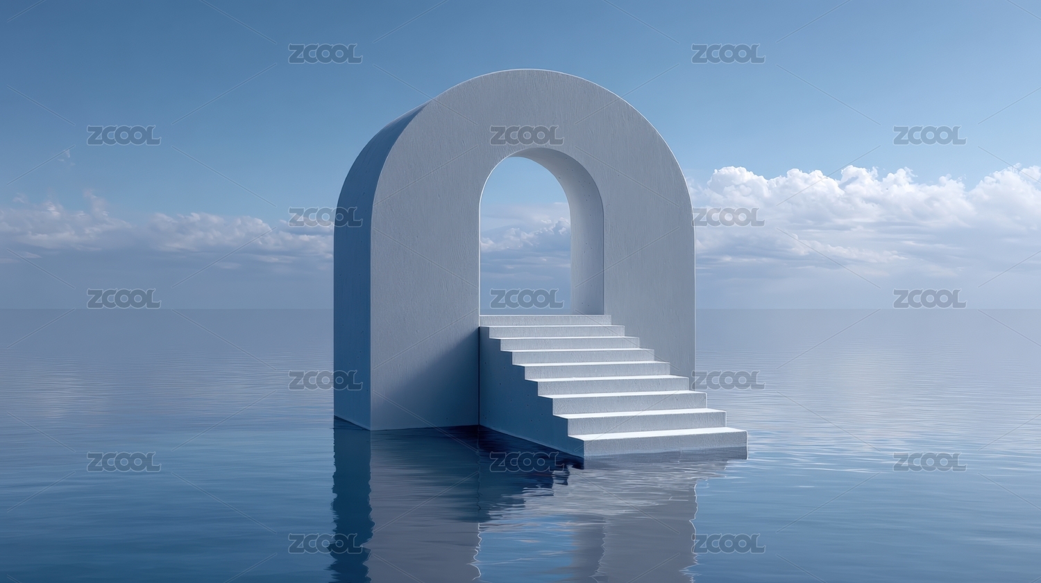 简约蓝色3D平静水面上的拱形门