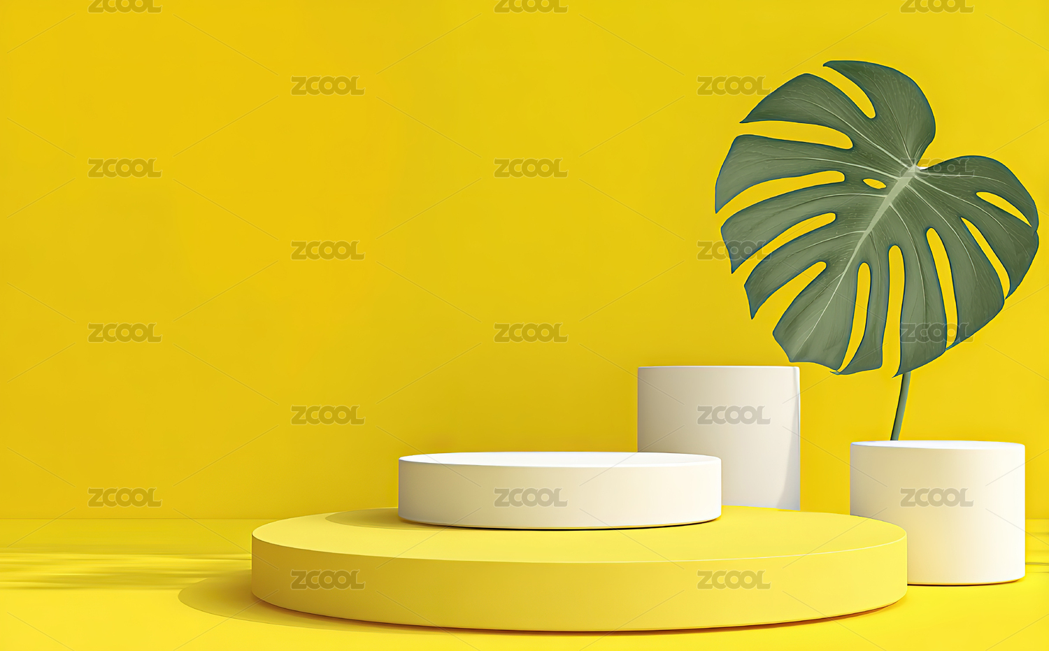 黄色背景上的白色圆台与绿叶装饰