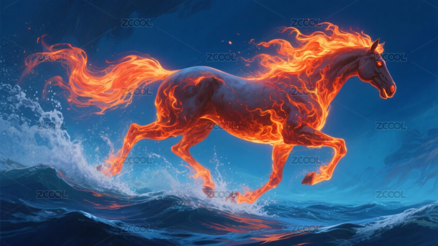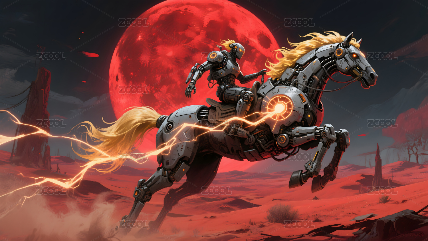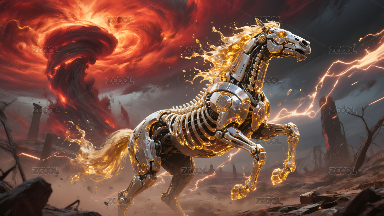 机械马,未来,科技,熔岩,火焰,战马,科幻,金属,奇幻