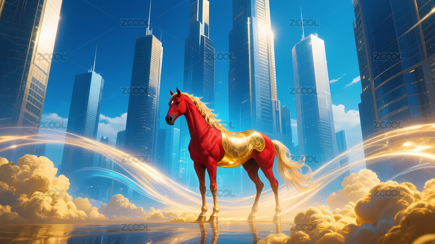 红色骏马蓝金城市背景