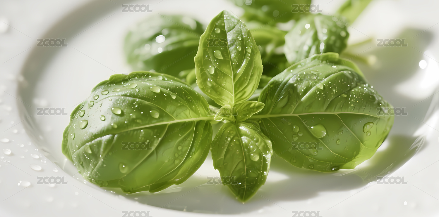 带有水珠的新鲜罗勒叶
