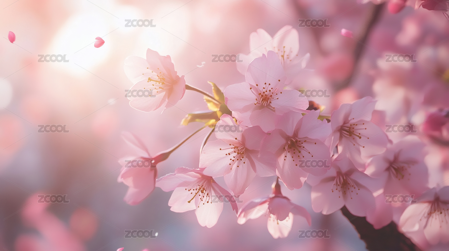 盛开樱花与粉色飘落花瓣