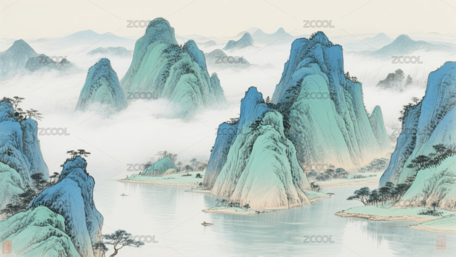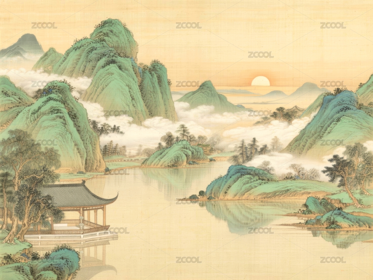 山水画,传统,中国,湖面,宽阔,平静,湖水,如镜,倒影,山峦