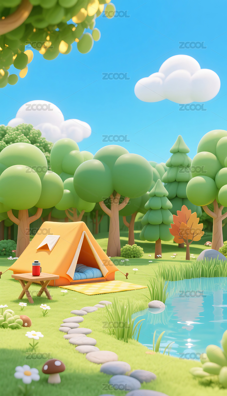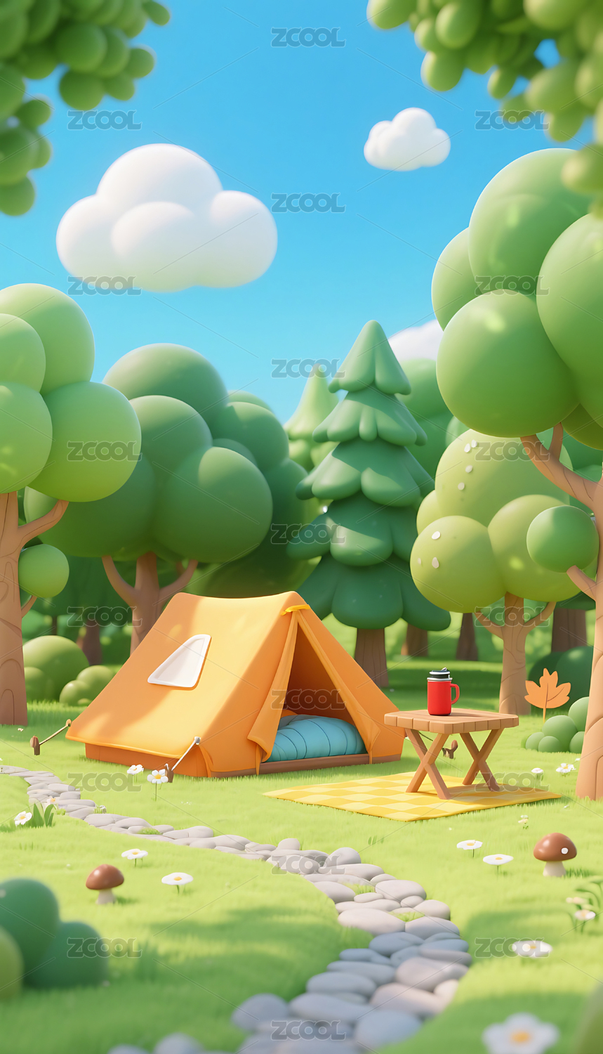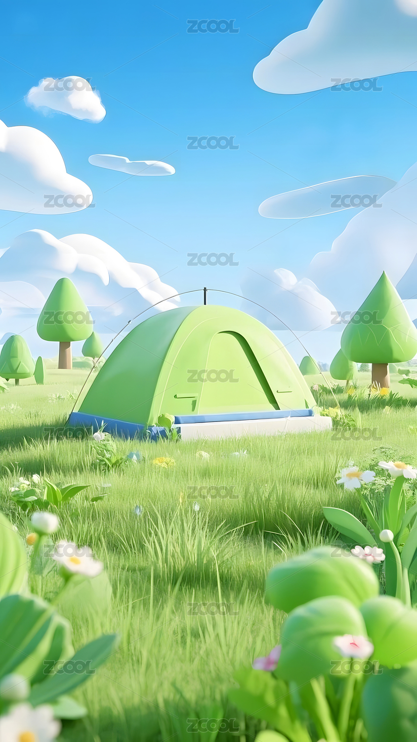 春天春日帐篷露营草地3D卡通插画