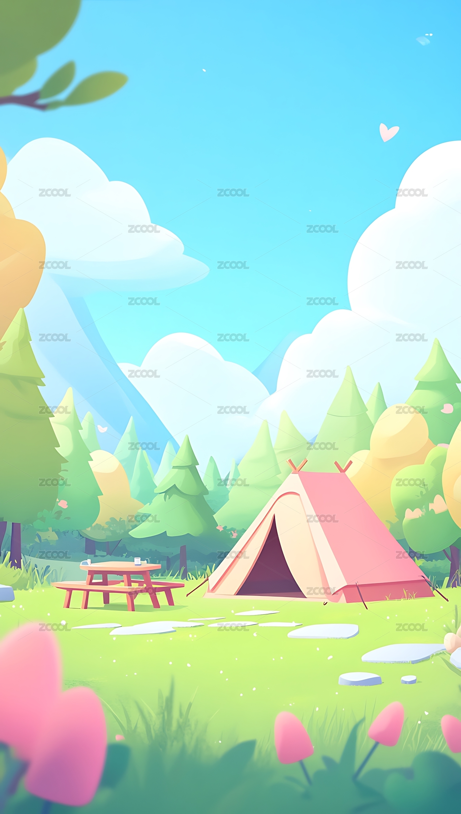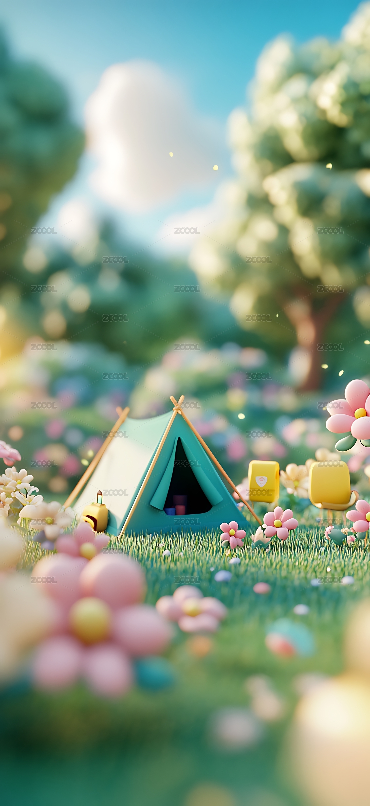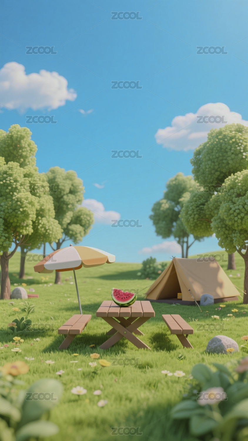 春天春日帐篷露营草地3D卡通插画
