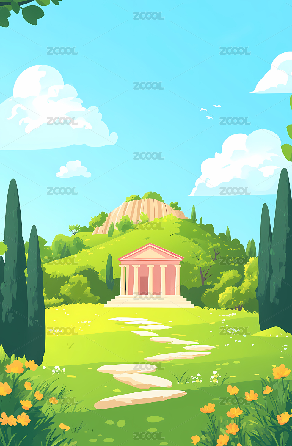 夏天户外旅行山峰房屋乡村风景蓝天白云插画