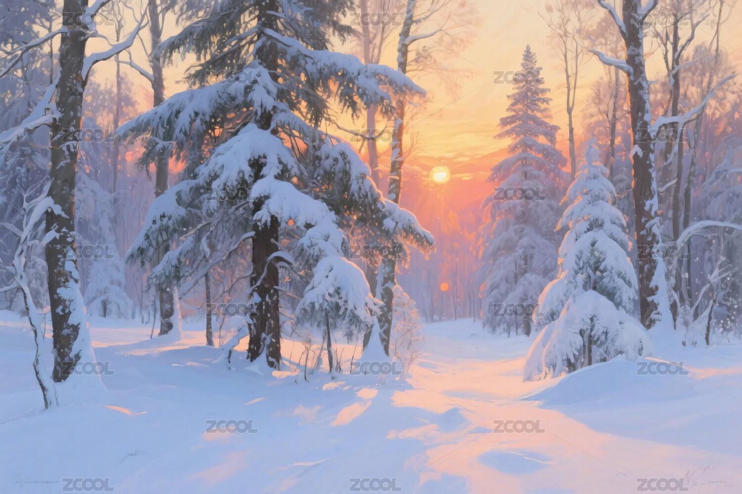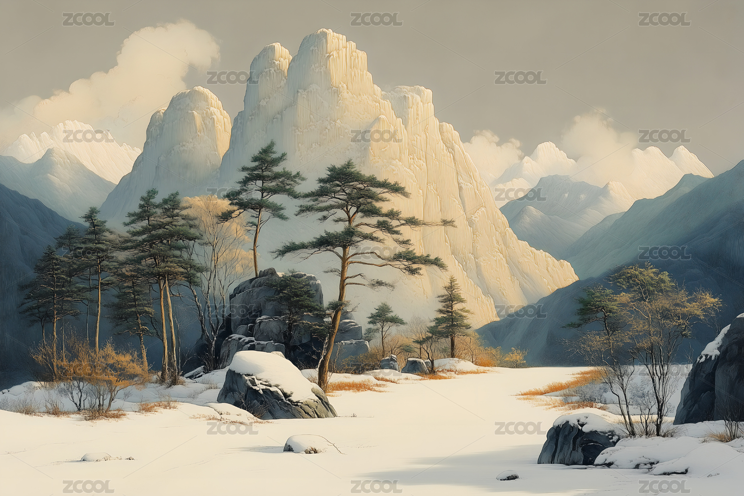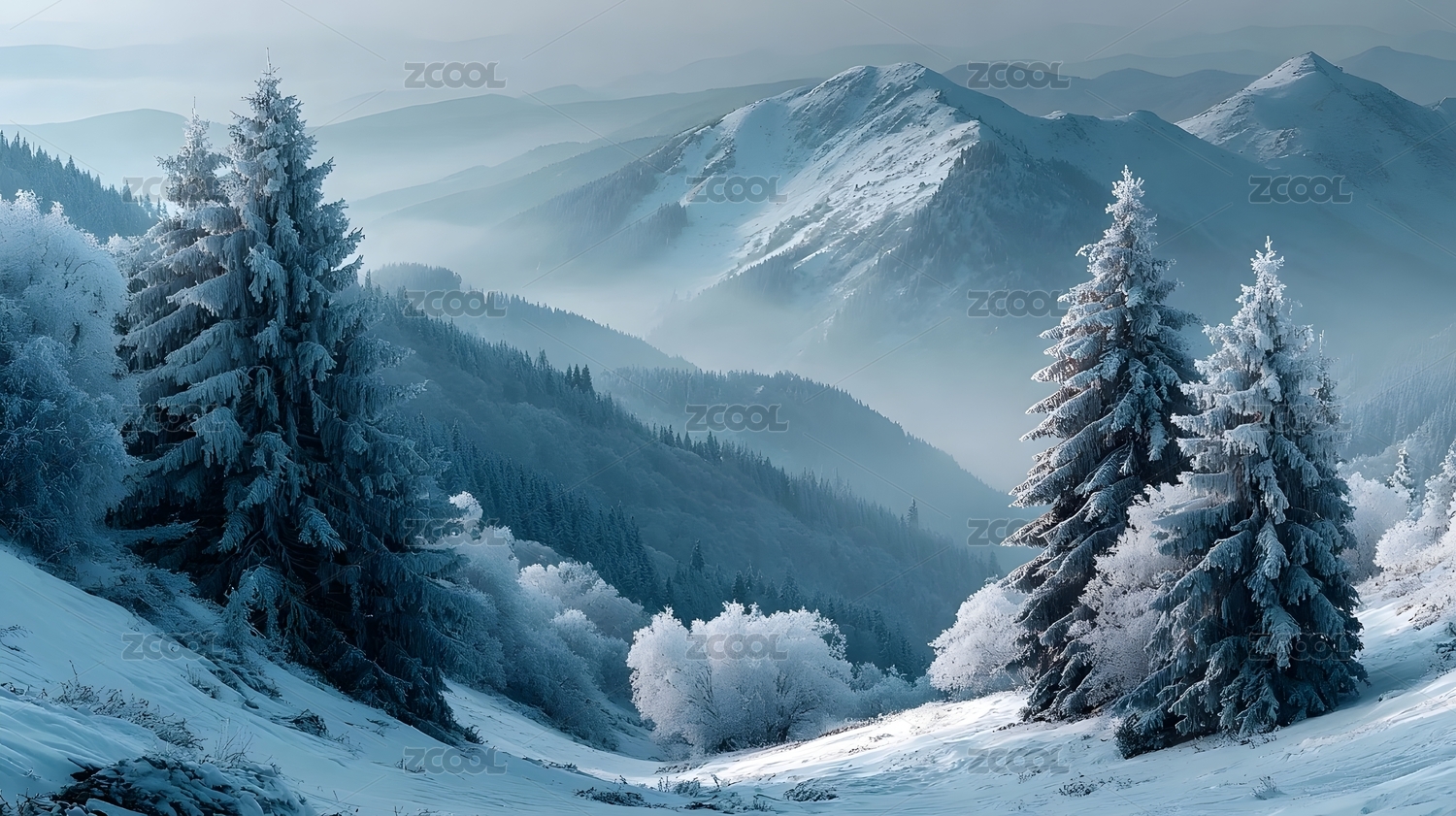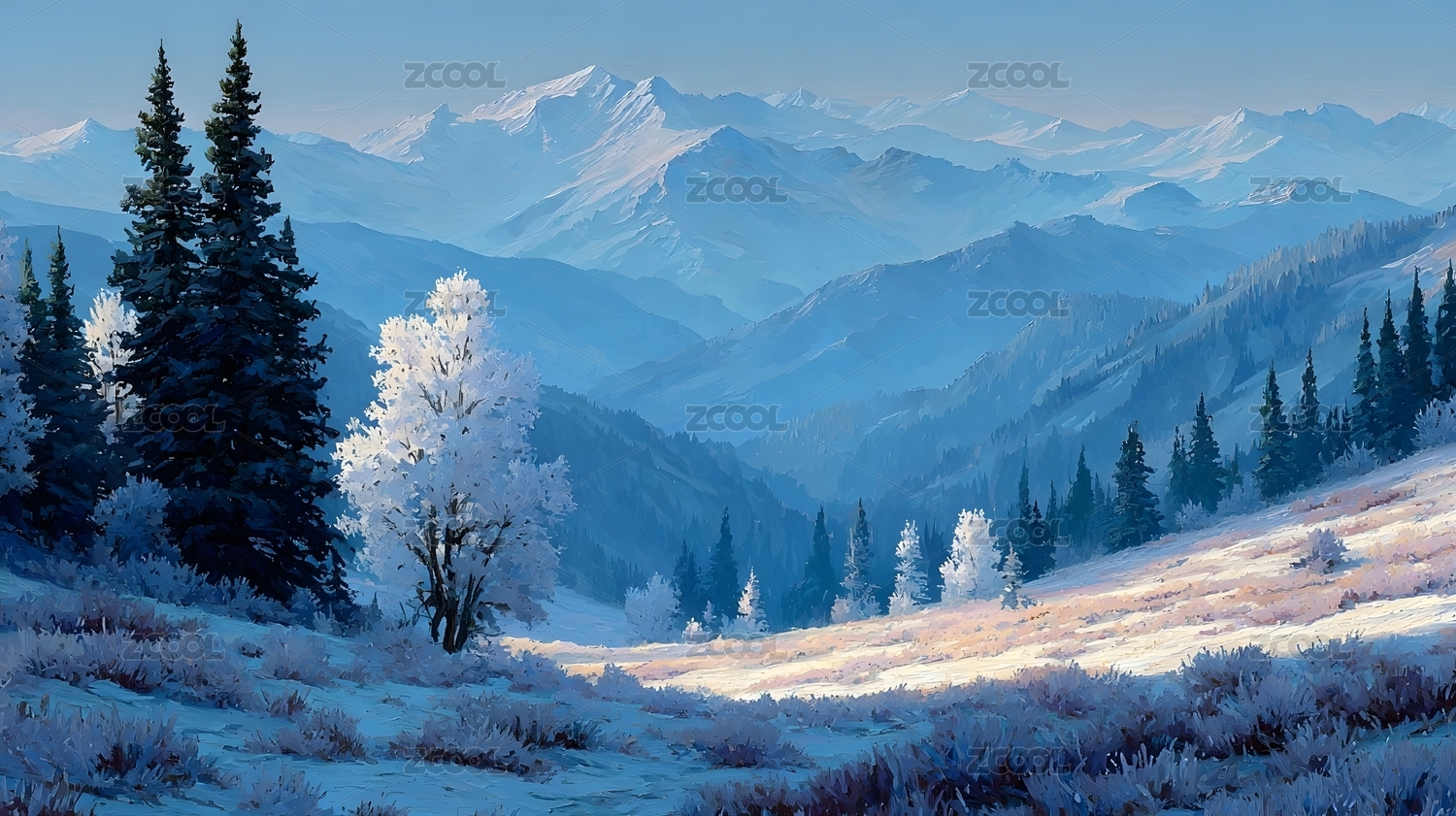 雪山,树木,雪景,自然,风景,插画,美丽,纯净,寒冷,季节