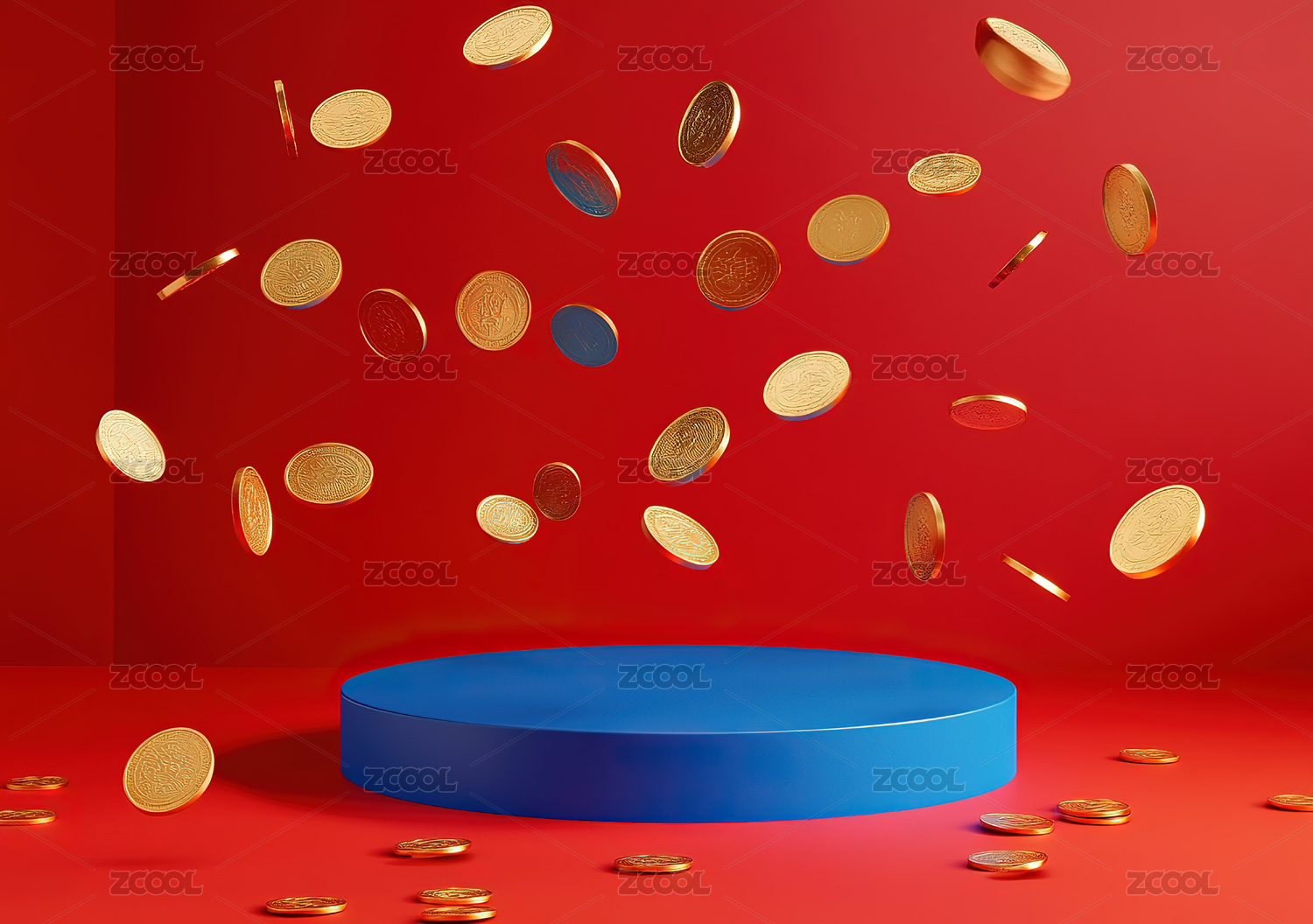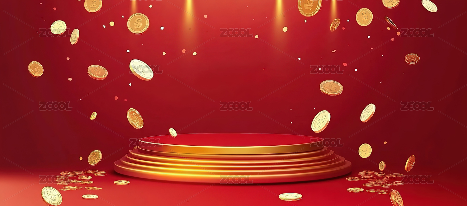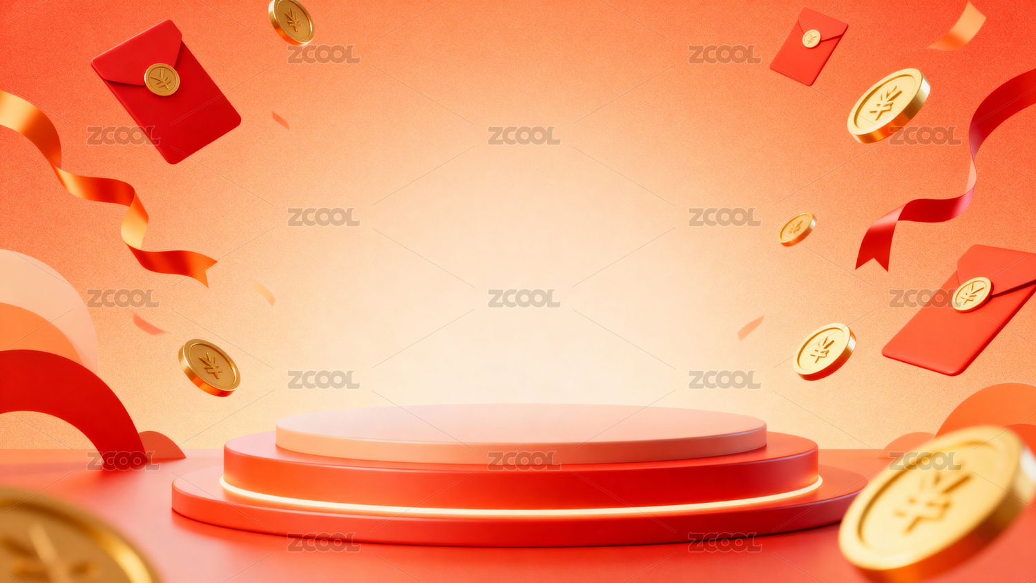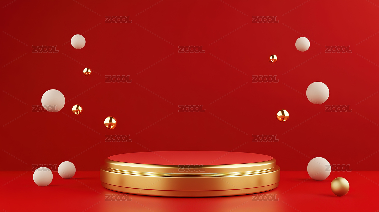 红色展台产品讲台3D背景,圆形金色霓虹灯