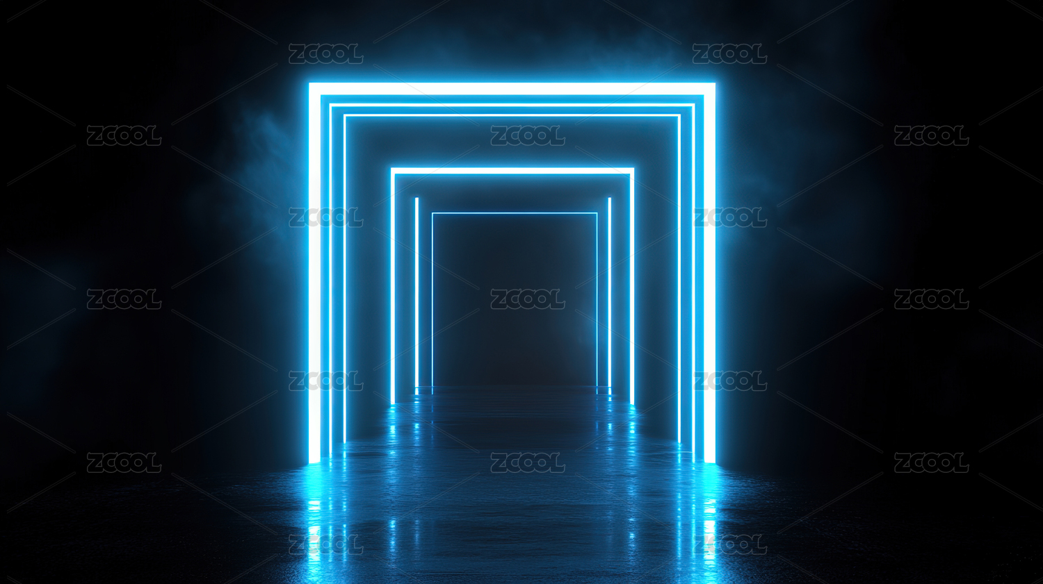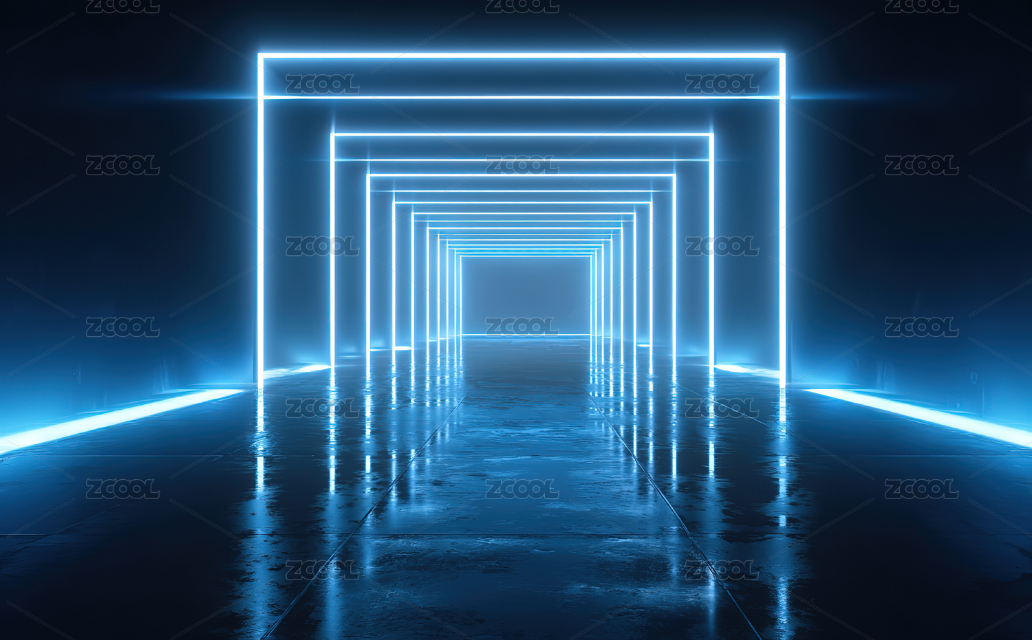 现代,霓虹灯,光线,空间,反射,地面,未来感,明亮,空旷,线条