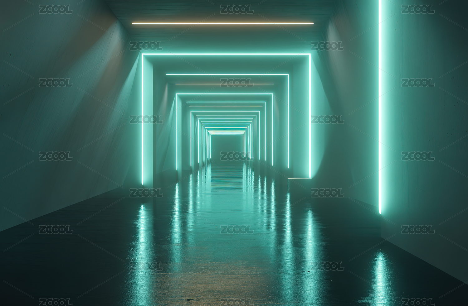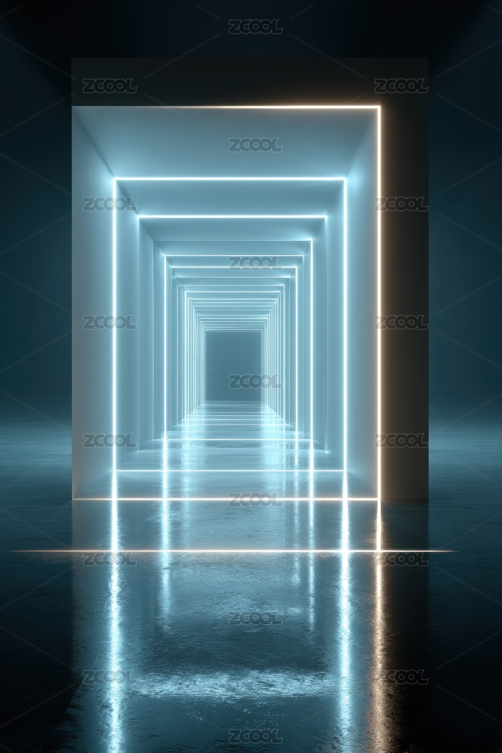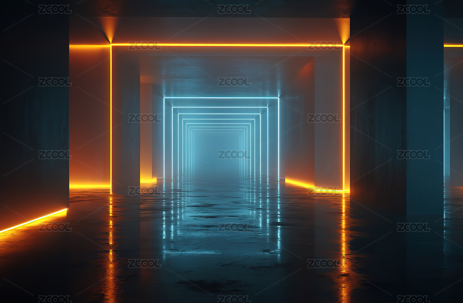 现代,霓虹灯,走廊,光线,空间,反射,室内,未来感,明亮,设计