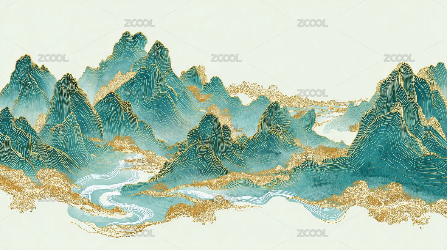 青绿山水金线勾勒的古典意境画卷