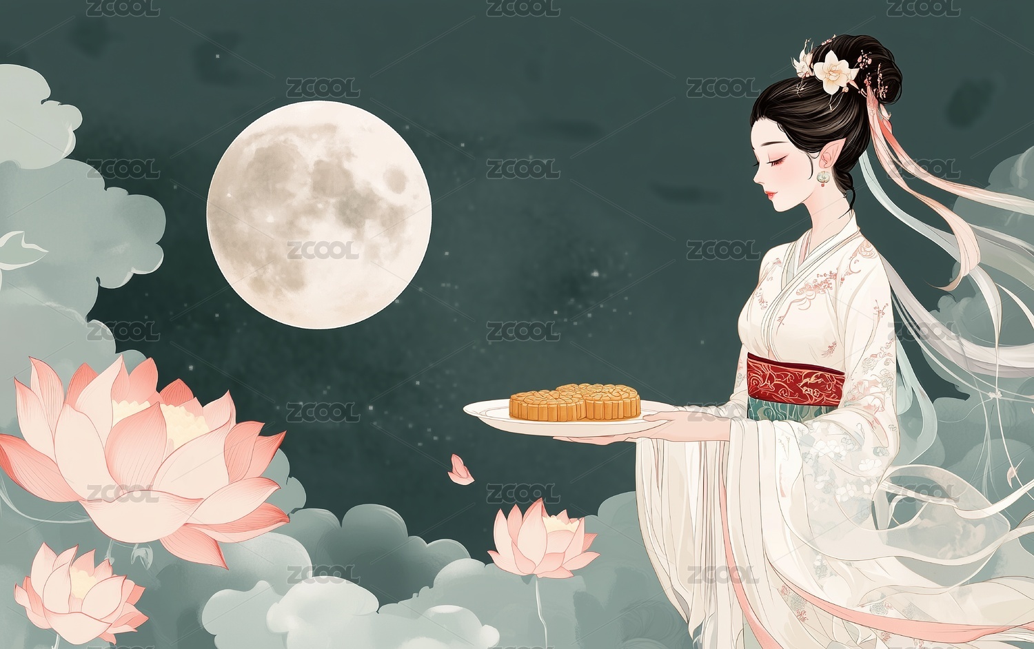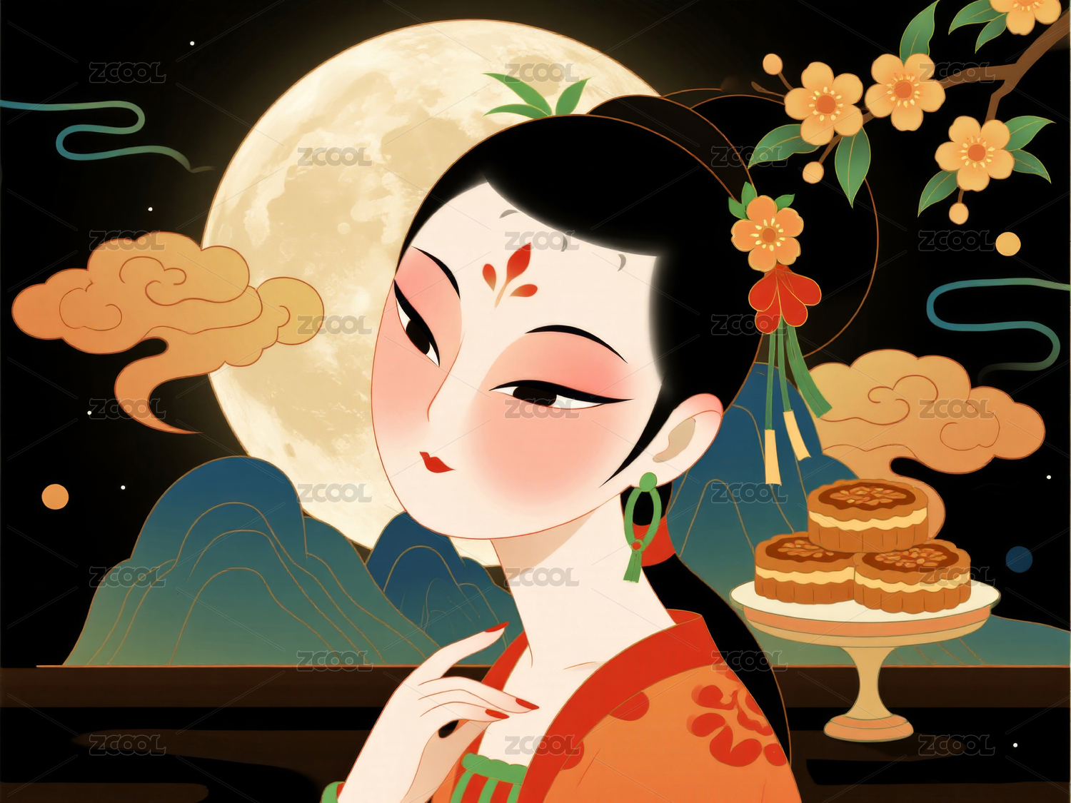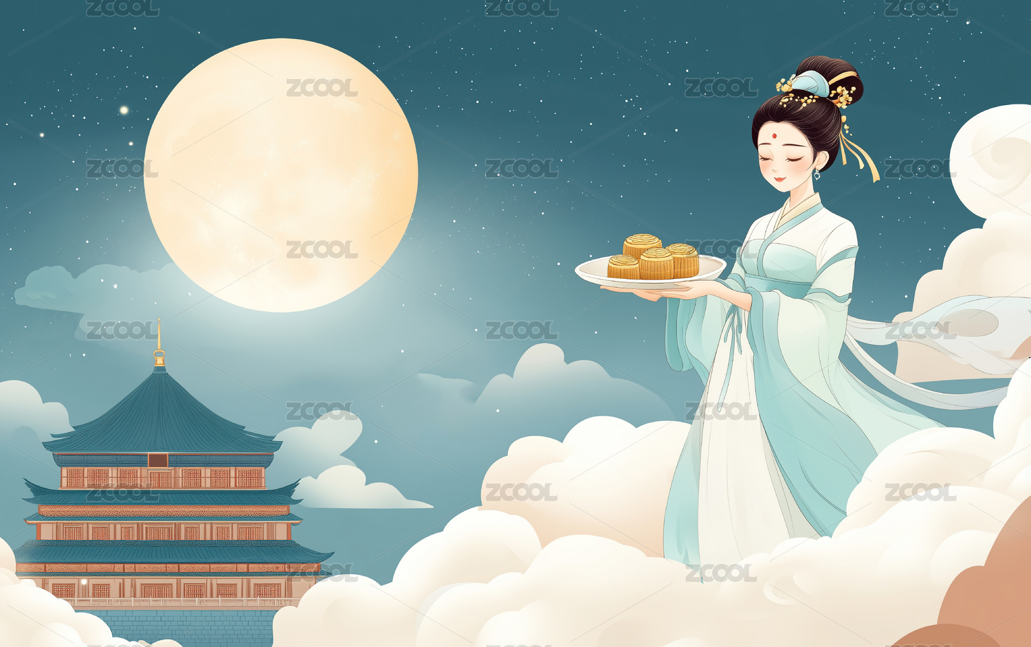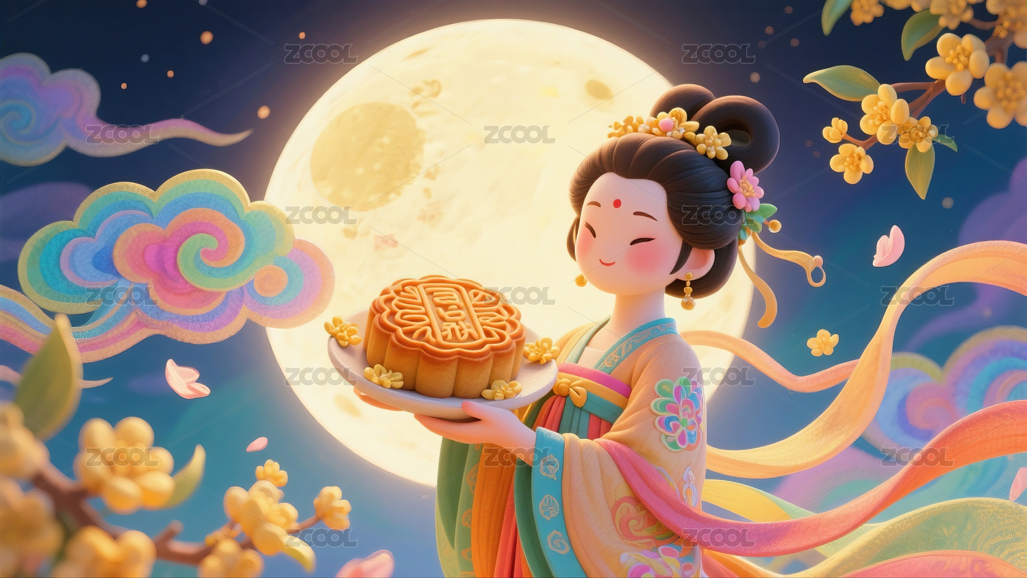 花好月圆夜嫦娥仙女手拿月饼赏中秋