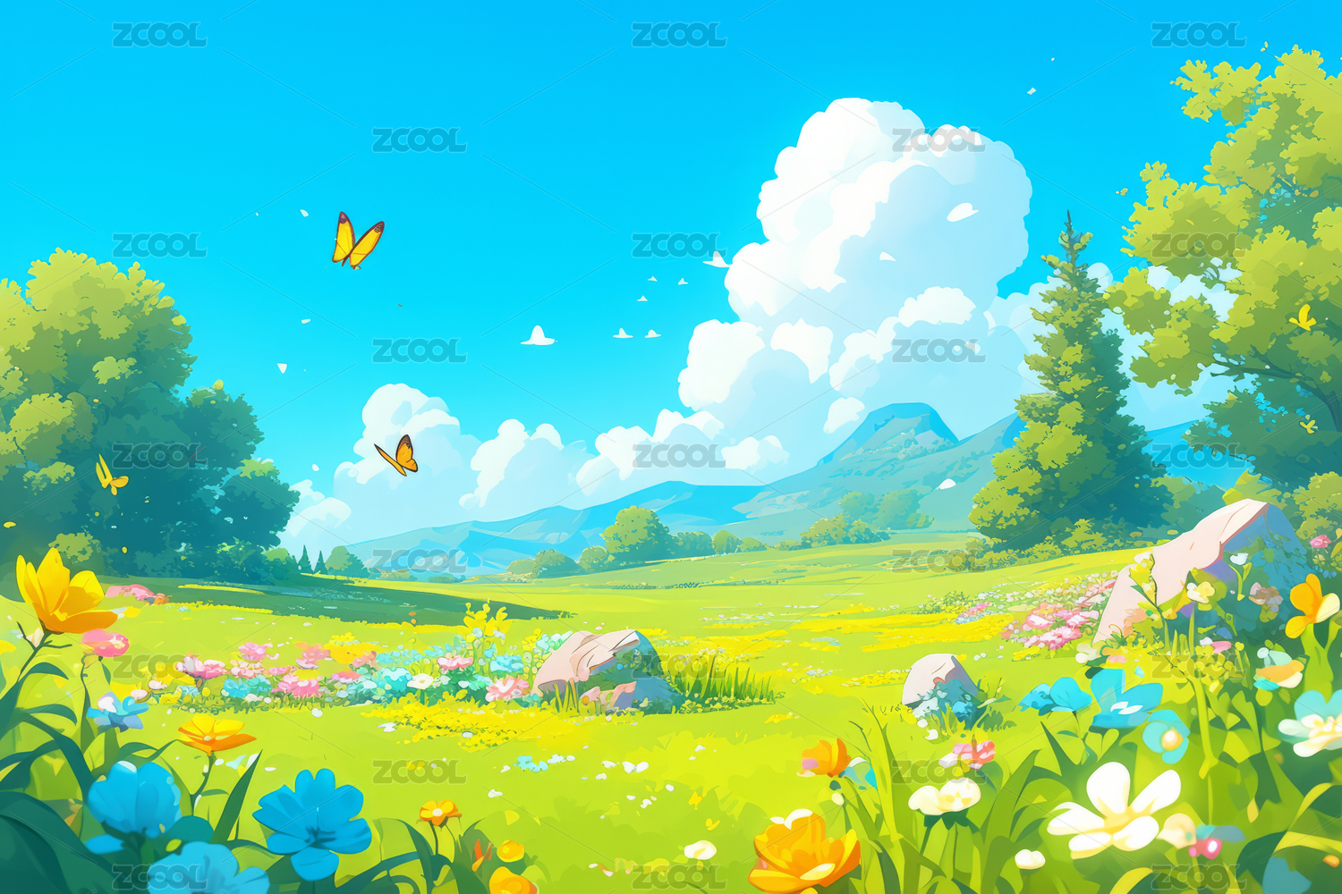 3D卡通春天草地可爱粉色花朵三维自然背景