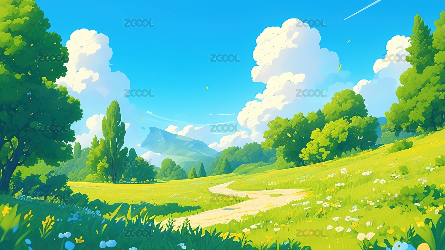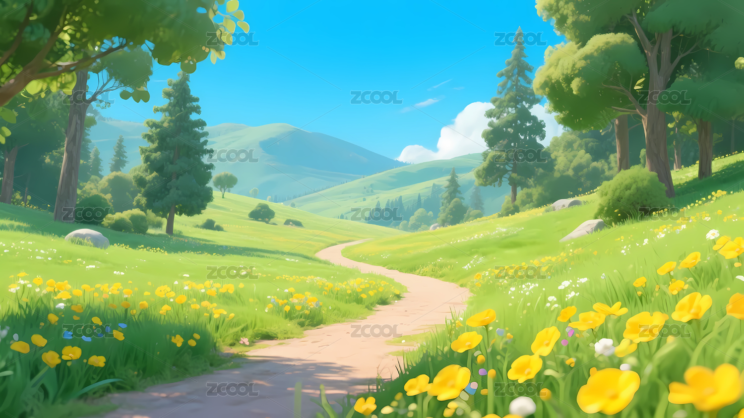 明亮,自然,白云,天空,小路,青山,花田,树木,和谐,美景