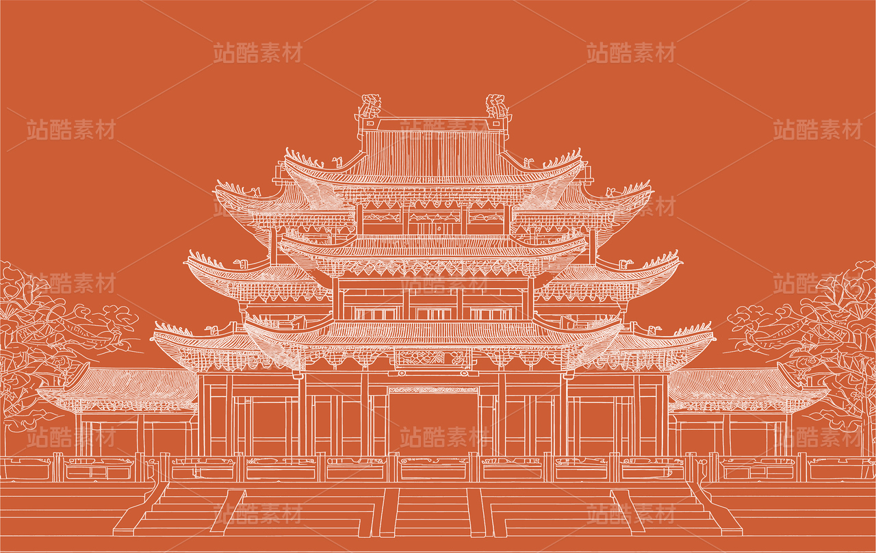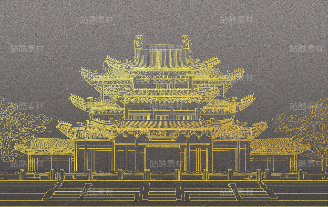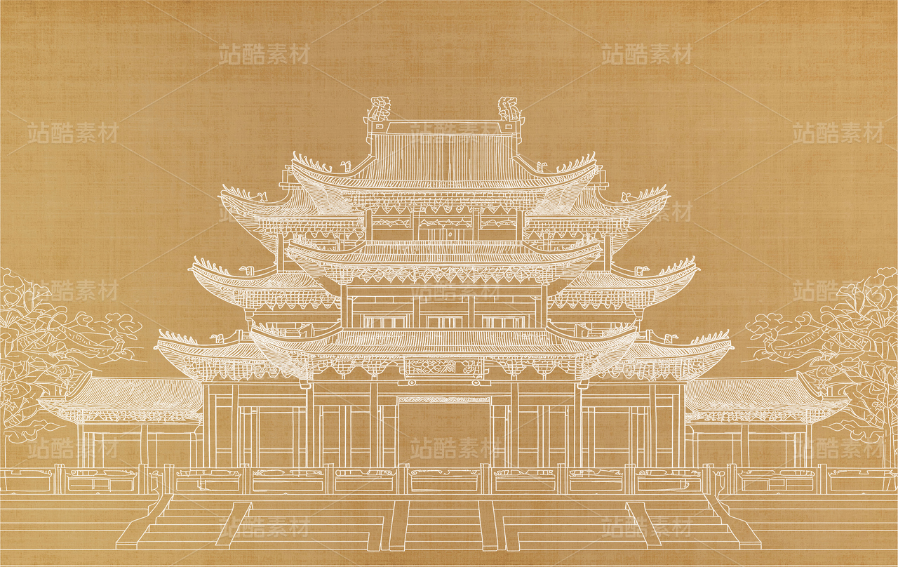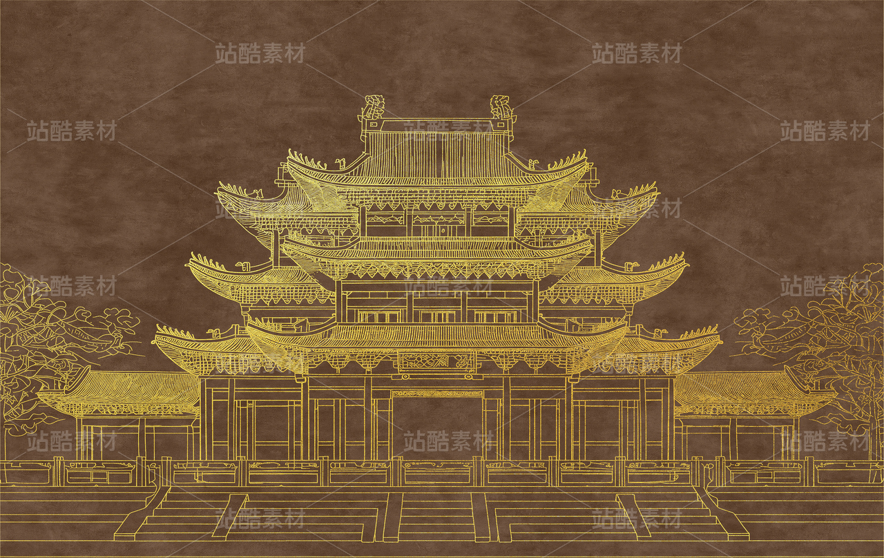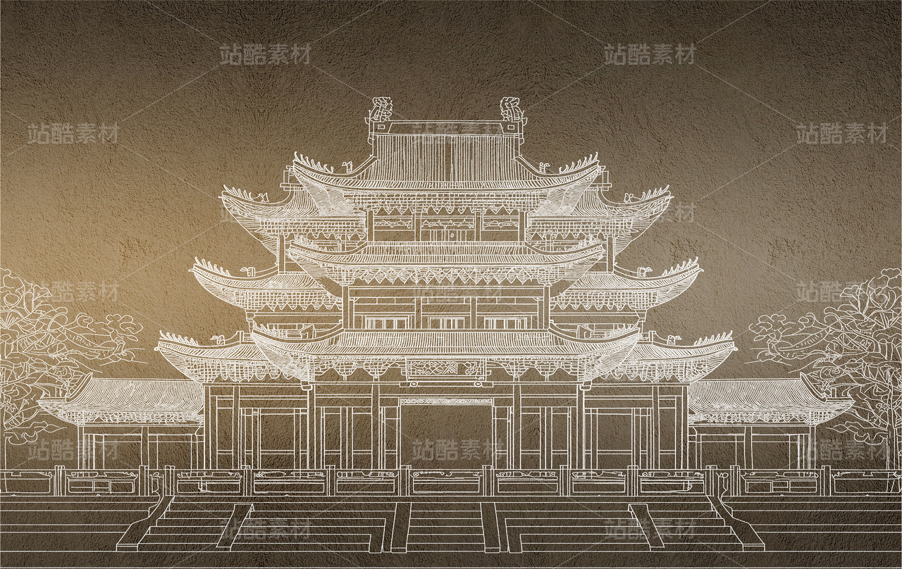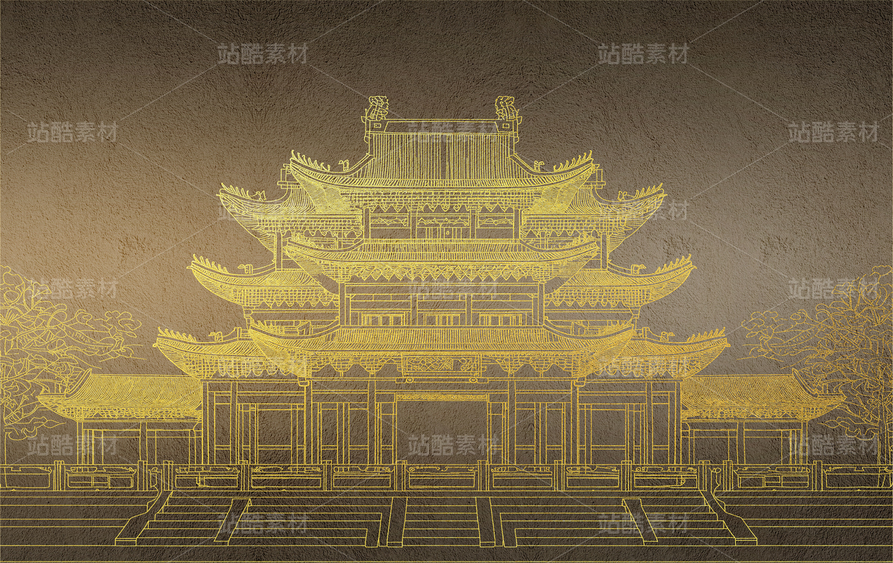 新中式国风亭台楼阁建筑工装背景墙壁画