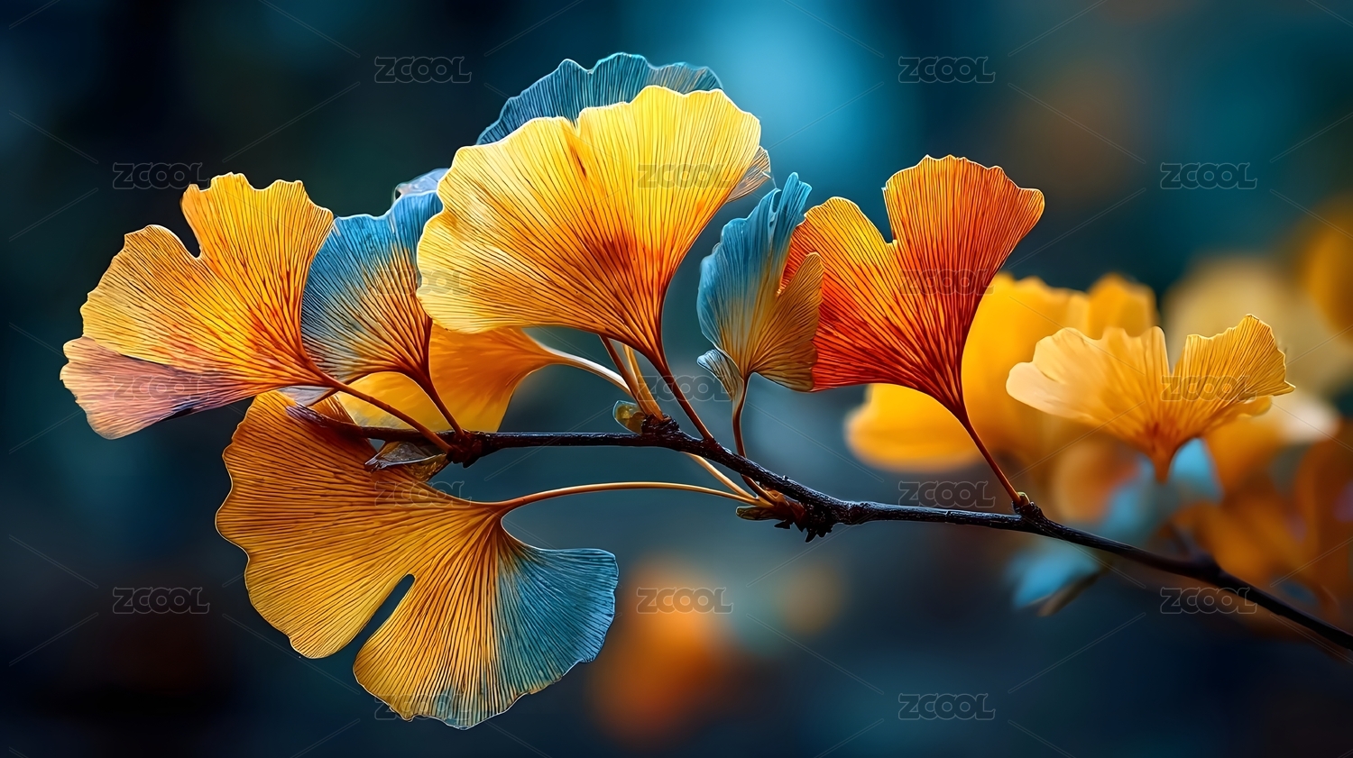 银杏,叶子,叶脉,黄色,蓝色,背景,枝条,植物,特写,秋叶