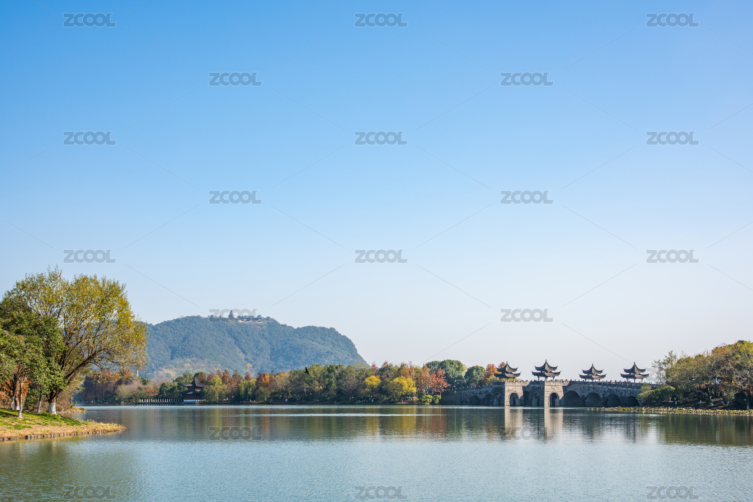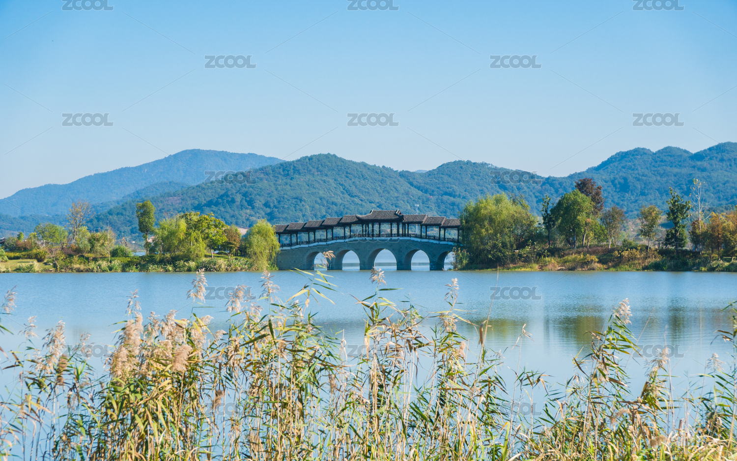 杭州萧山湘湖泳月桥江南水乡秋天自然风景