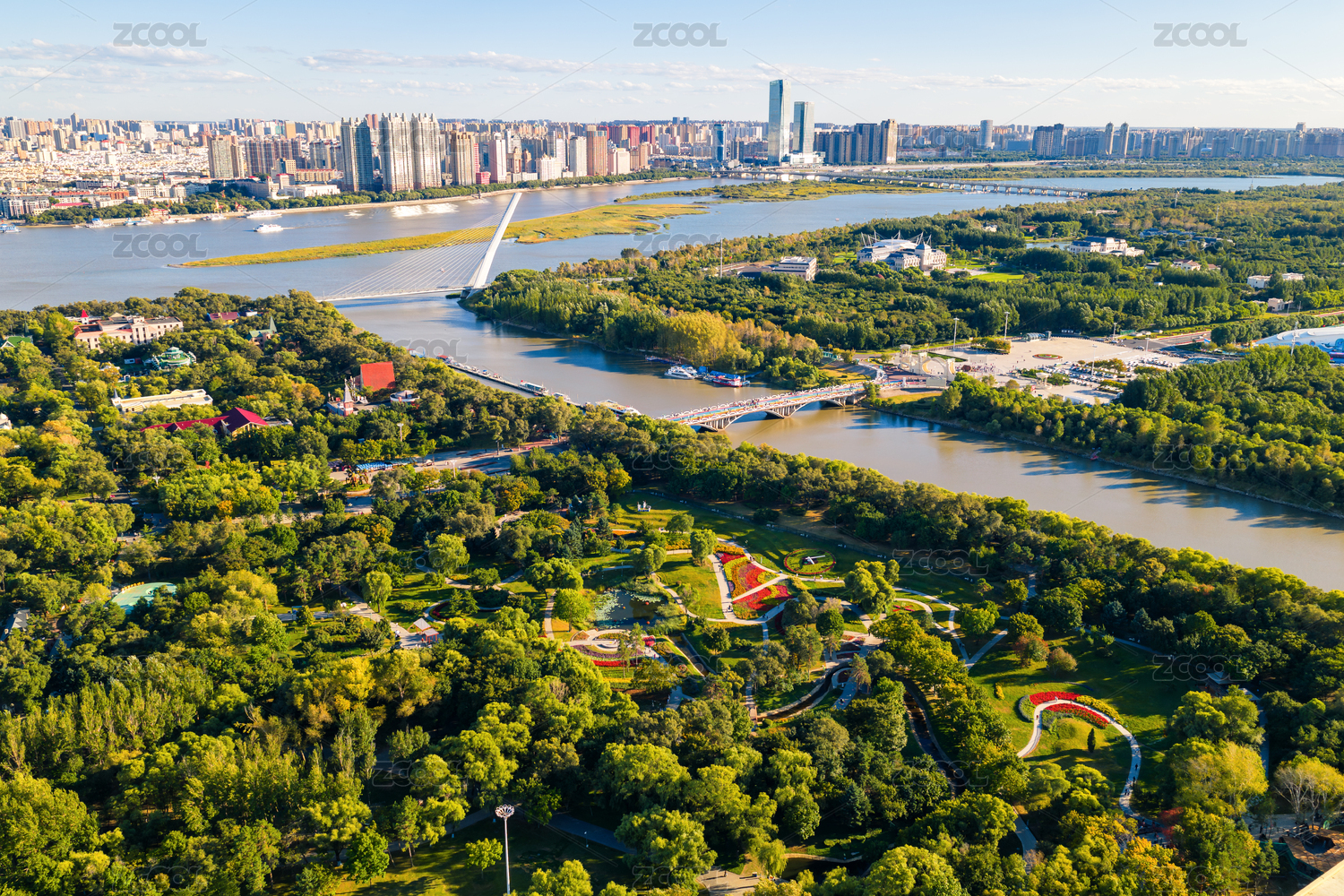 中国黑龙江哈尔滨太阳岛风景区城市风光航拍