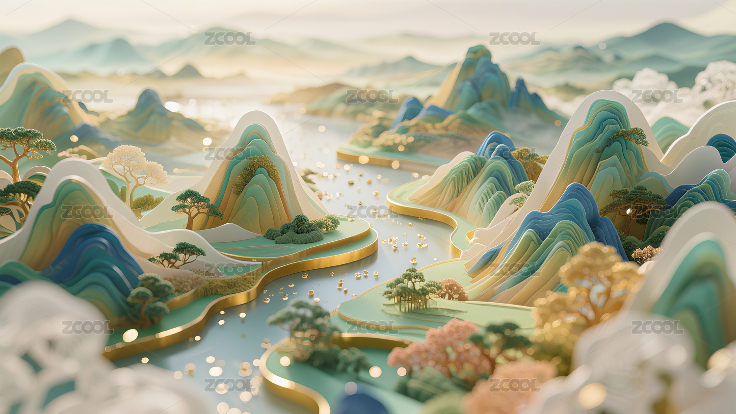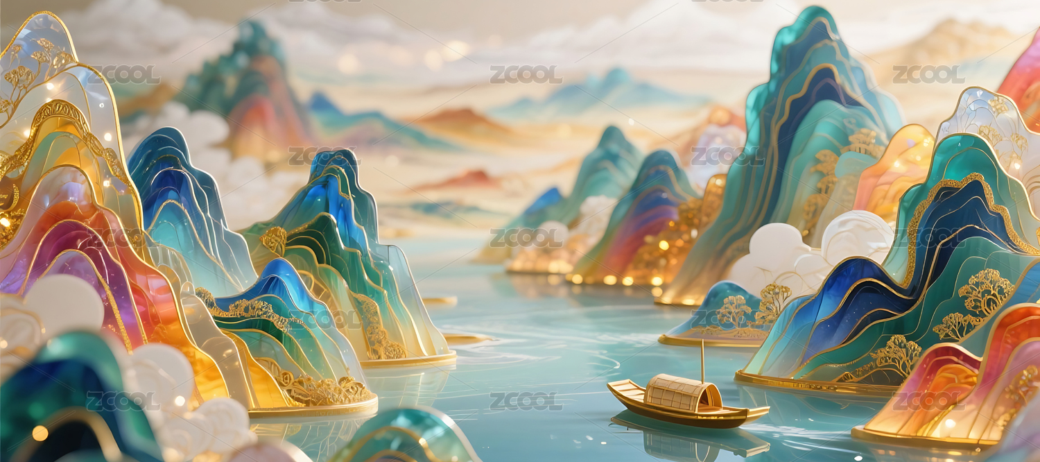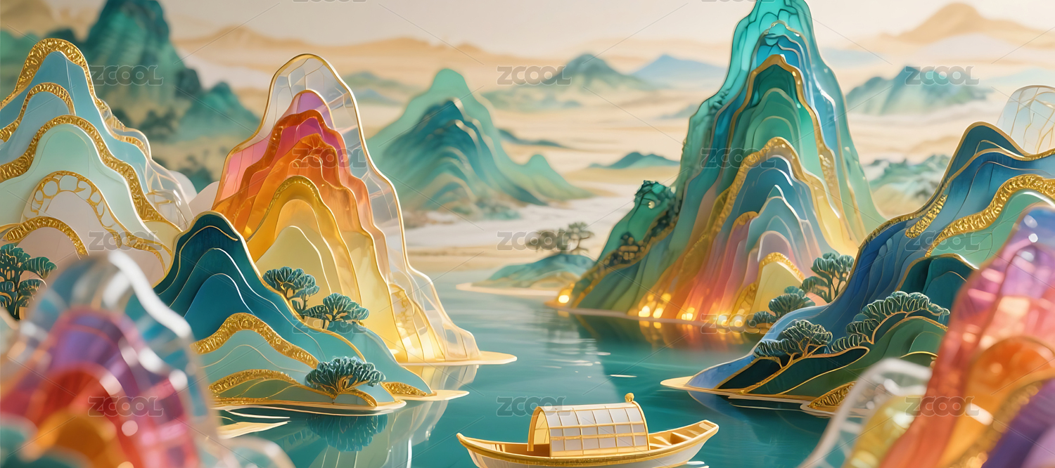 国风,玻璃,立体,山峰,纸雕,抽象,山水画