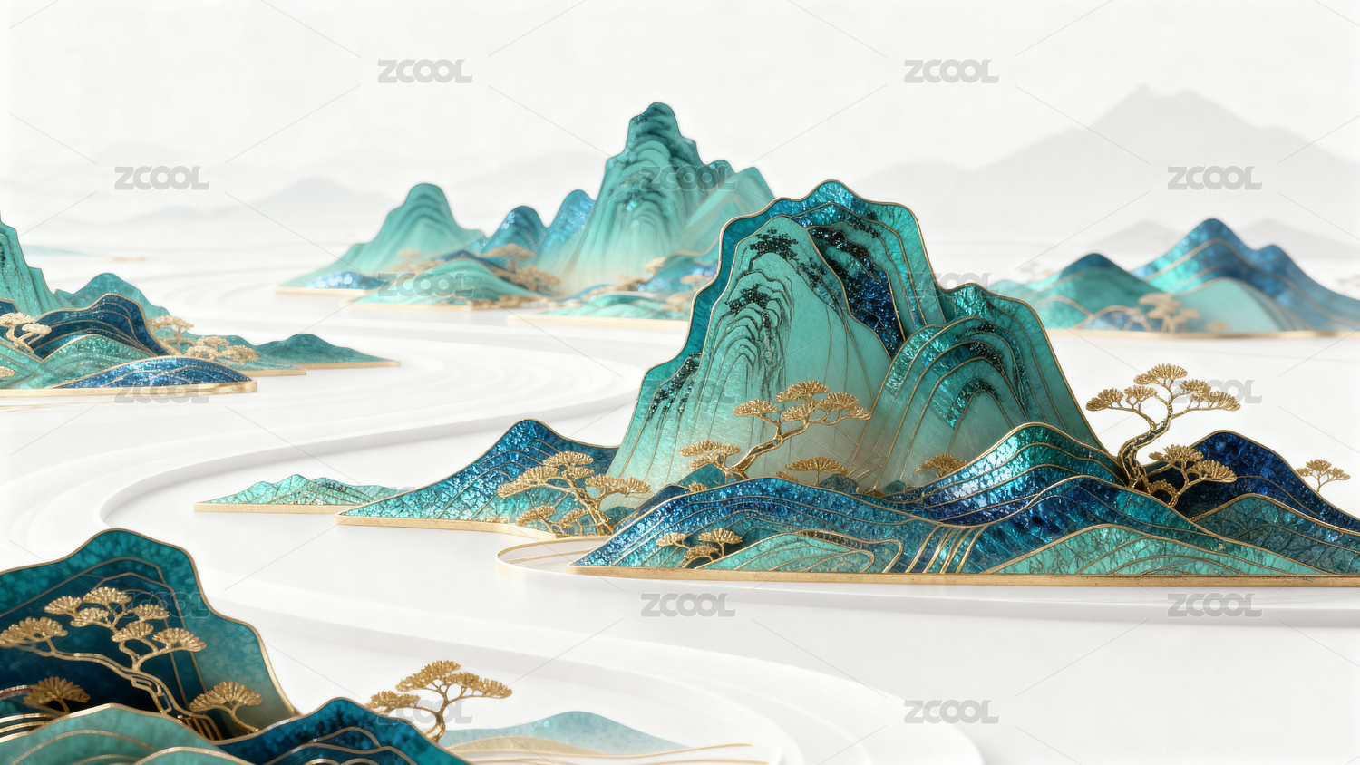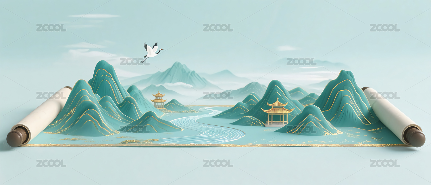 中国传统浅蓝色山水古风国风水墨画背景壁纸