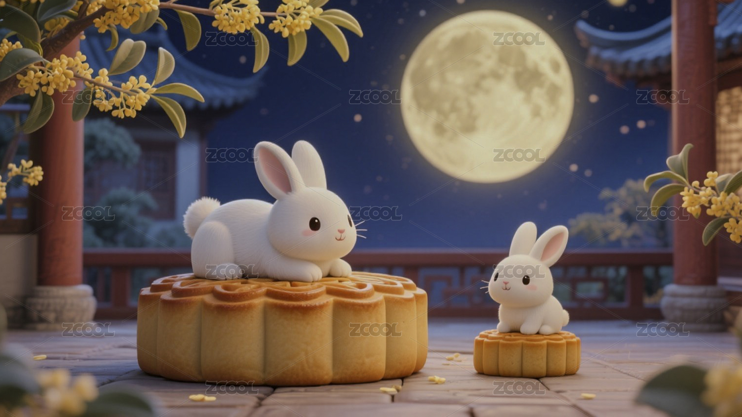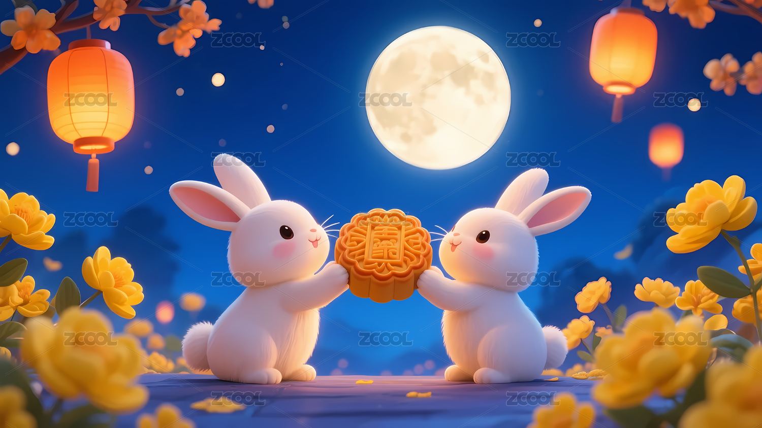 中秋节,玉兔,月亮,月饼,团圆,节日,卡通,可爱,草地,鲜花